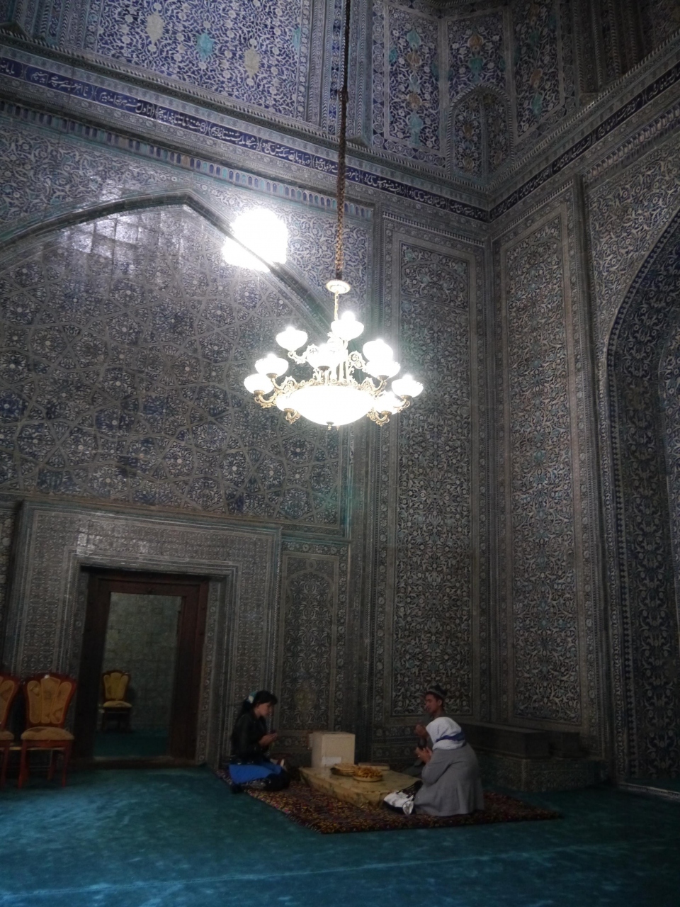 共通チケットとは別に、5000スムの入場料が必要でした。廟の中は青いタイルで覆われており、聖職者の方が隅の方に座っていました。静かな空間で、とても美しく、時折訪れる信者のために聖職者が読み上げるコーランの声が響いていました。