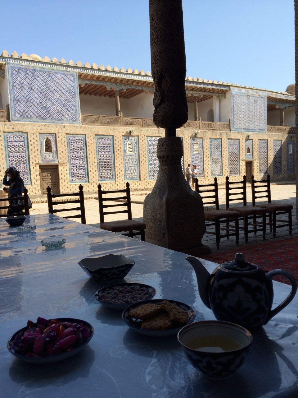 見られる部分は中庭部分だけで小さいですが、青いタイルや細かく彫刻された柱が美しいです。言った時は昔の衣装を着た人たちが劇をやっていて、興味深かったです。中でお茶が飲めますが(ビスケット付き)、6000スムと高いので要注意です。
