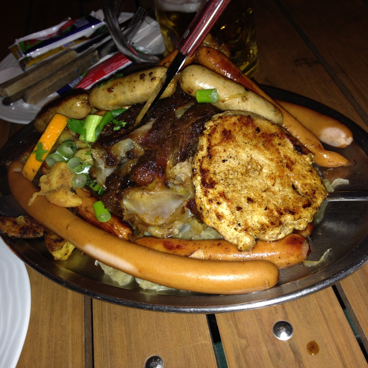夕食を食べるために人通りの多いレーマー広場に行き入ったお店です。店内はいっぱいだったので、外で食べると伝えると店員が寒くないようにとストーブを持ってきてくれたり、毛布を用意してくれたりしてくれた。ドイツ語のメニューが分からず困っていると、店員が写真を指さしながら、これがおすすめというのでソーセージの盛り合わせを頼みました。すぐに盛り合わせ(ソーセージ数種類・ポテト・キャベツの酢漬け)がすごいボリューム(2人分)とビールでドイツ料理を満喫できました。ここではフランクフルト発祥のアップルワインも飲めました。観光客値段ではあるが、十分堪能できました