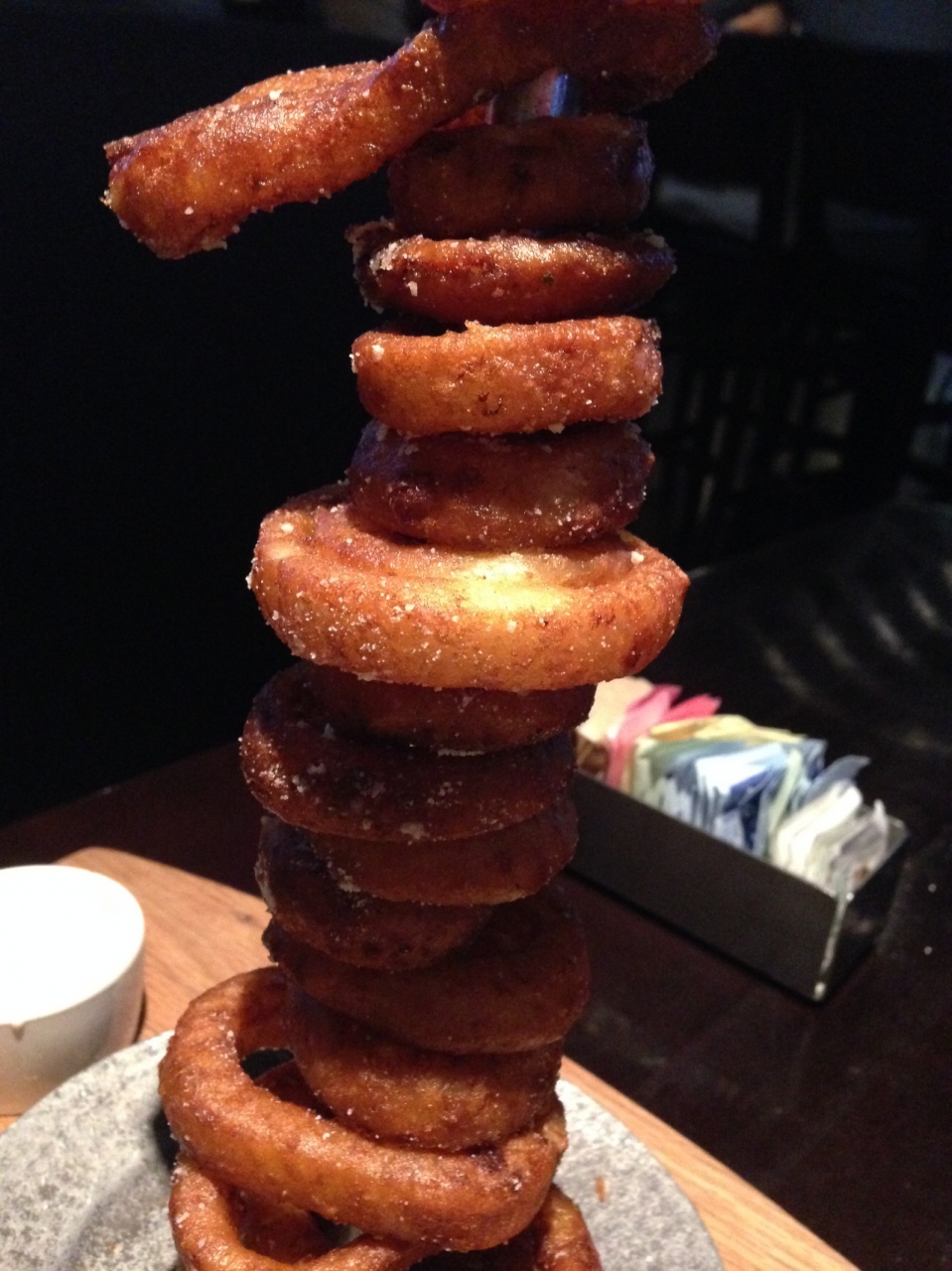 中に入ると意外と広い。暗いけど。飲み物メニュー充実してます。ビールの種類も多いです。名物のデカいグラスは最後の方、温くなりそう。飲み物は早く出てきたけど、食べ物が全然出てこなくって心配したけど、一気に出てきた(笑)ボチボチ出してもらいたかったナ。オニオンタワーめっさ美味しかったです。衣がサクサク。冷めてもサクサク。ステーキは食べるつもりなかったけど、勢いで注文。意外とイケました。リピありのお店です。