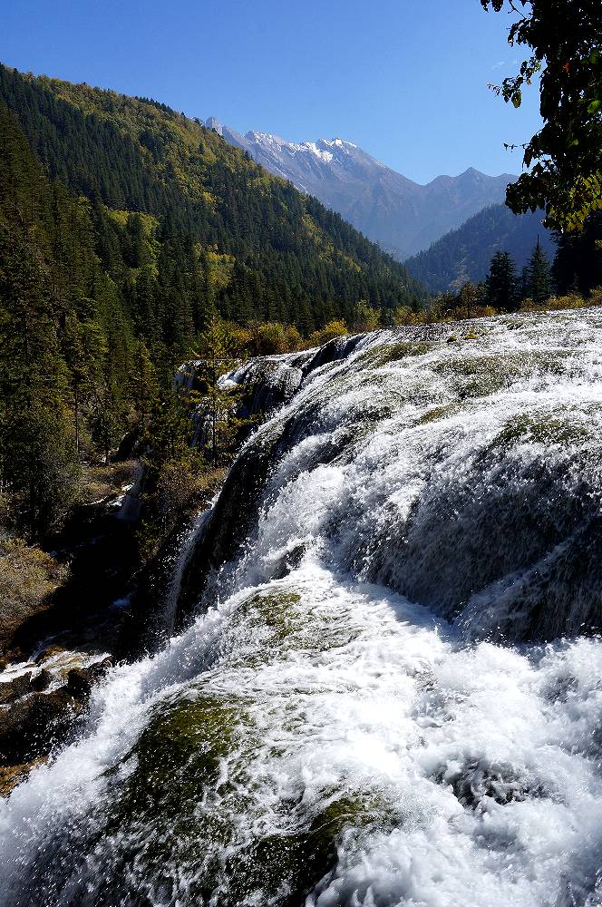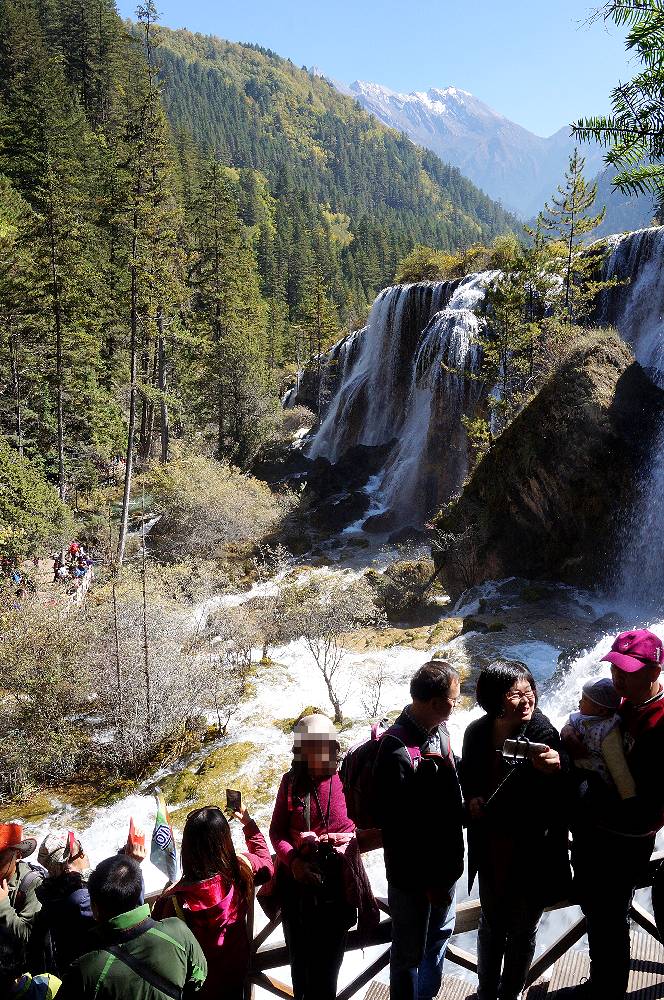 私達は10月の14日の紅葉シーズンの晴天時に訪れましたが、9月中ずっと雨天が続いていたせいか、水量も十分で迫力ある滝を見ることができました。遊歩道は、滝の上部から滝のすぐ横を通って、滝の下まで続いていて、特に滝の横の道は絶好の撮影アングルになっていました。中国人は記念写真や自撮りが非常に好きなので、そのせいで人の流れが滞ってしまうほどでした。滝の下は水しぶきがすごいので、カメラの保護のためにも撮影は短時間にとどめた方がいいでしょう。滝の下に出ると、正面から流れ落ちる滝を見上げるようにして、遊歩道が続き、さらにその先にも小さな滝がいくつか流れ落ちていて、長い間滝の流れ落ちる風景を楽しむことができました。