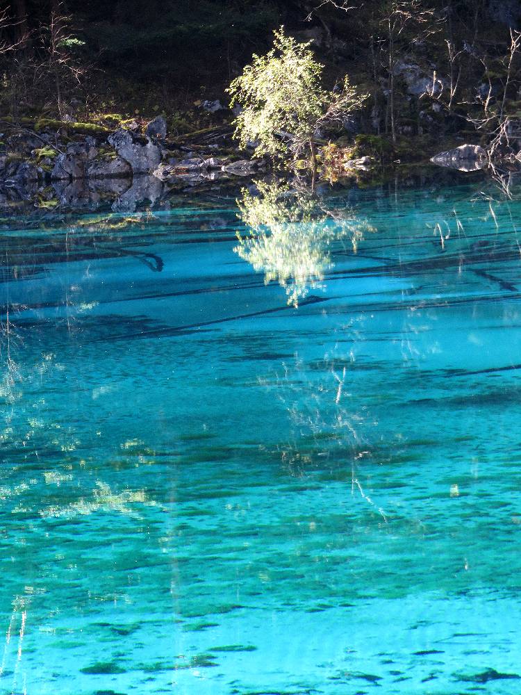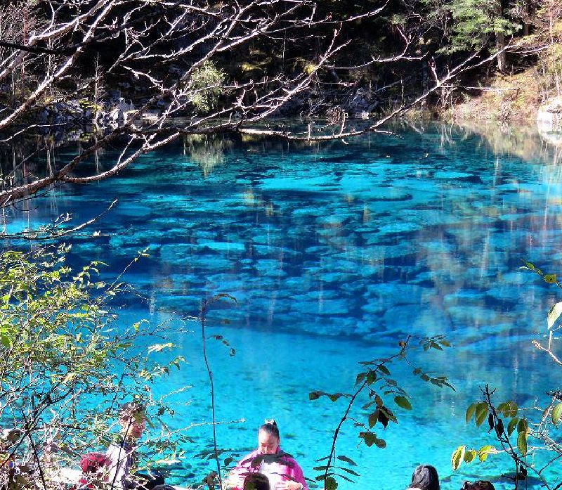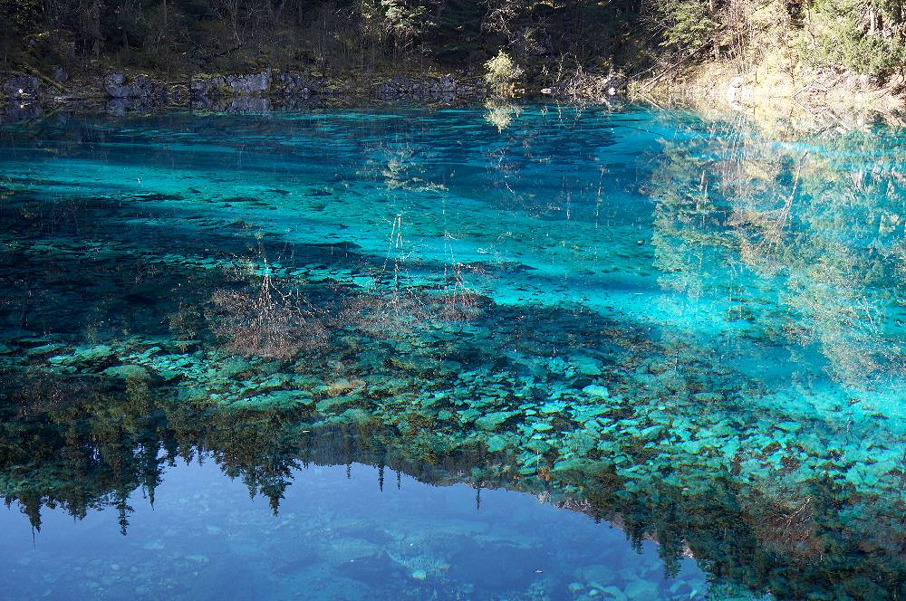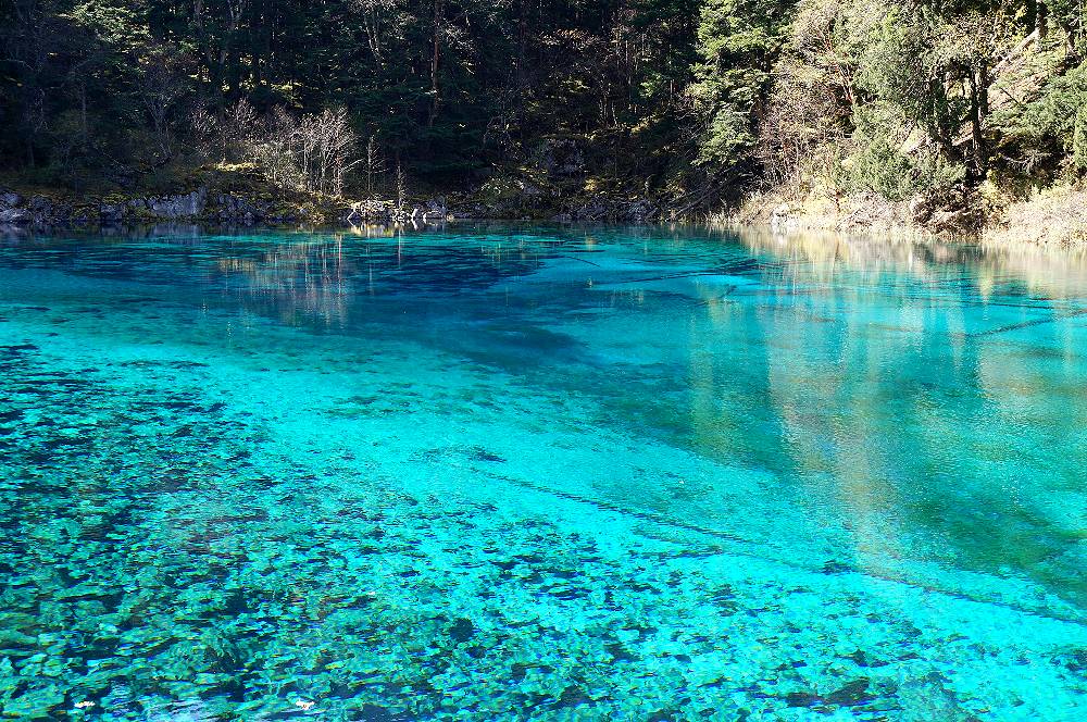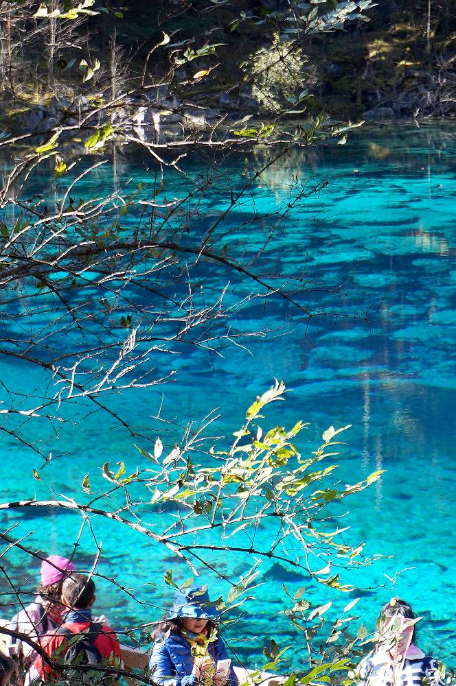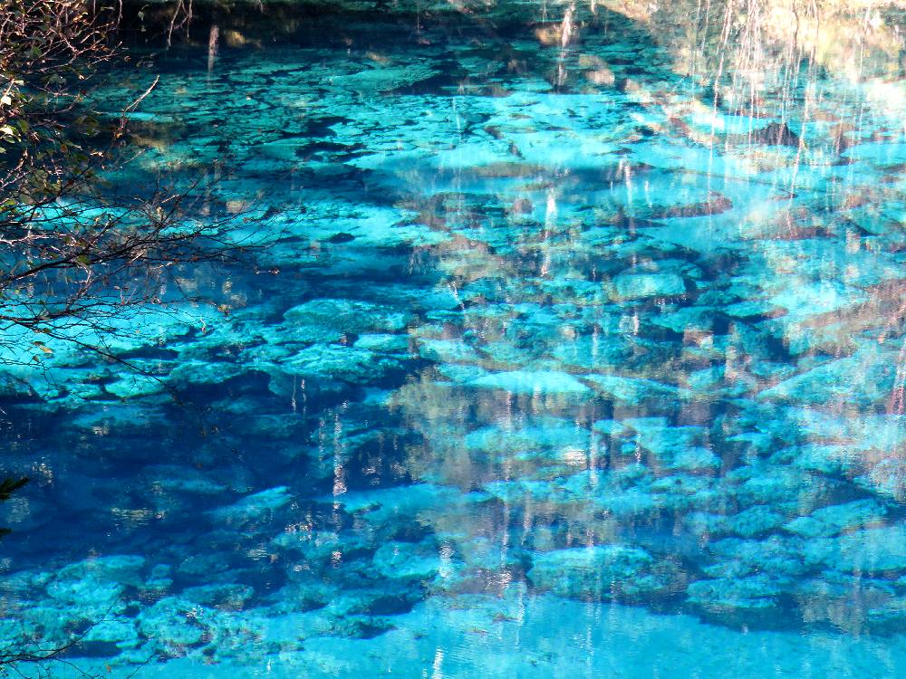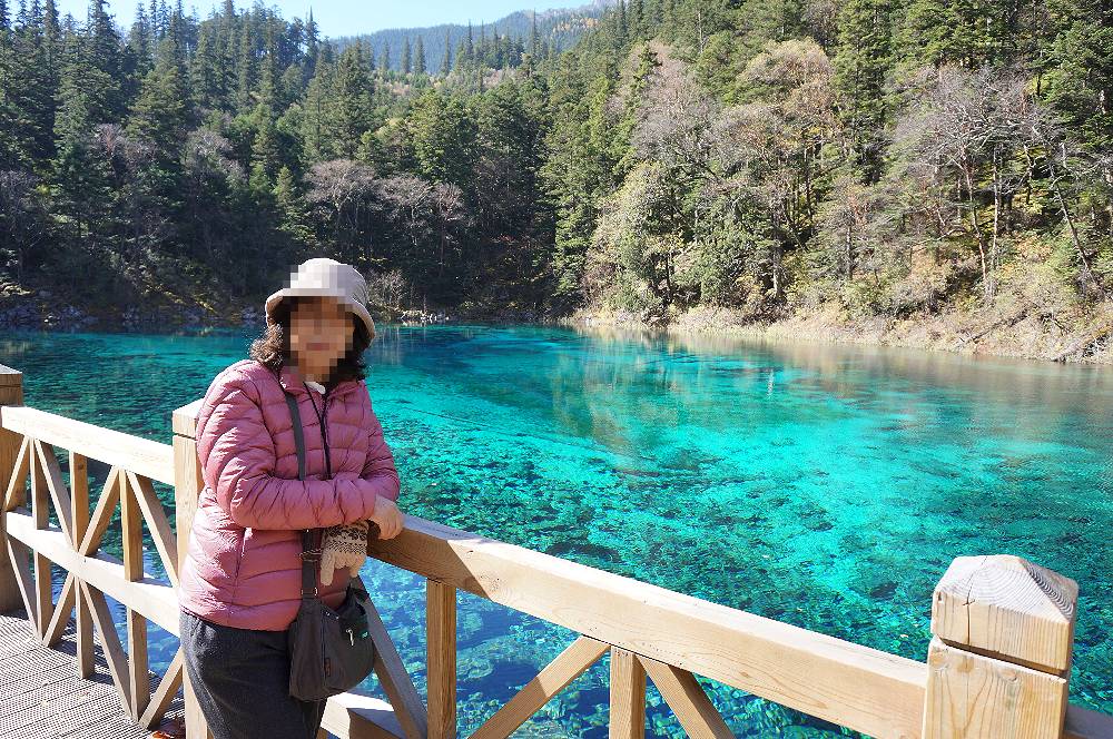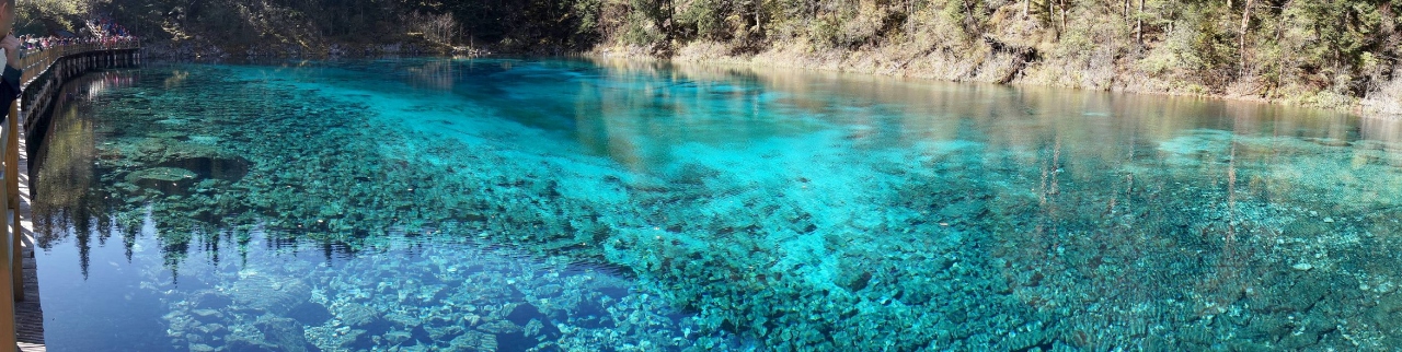 2015年の10月15日、九寨溝観光2日目の午前10時少し前に長海の後に行きました。人気スポットだけに多くの観光客でごったがえしていましたが、私達は個人旅行で来ているし、2日目の目玉ということで、時間に余裕があったので、1時間位いました。その間一時ツアー客がいなくなるときがあり、ゆっくり撮影ができました。最初湖岸で撮影していたのですが、対岸の紅葉が池の面に反射して、この世のものとは思われない水の色とが混ざり、ごちゃごちゃした写真になってしまうことに気付きました。湖岸から少し高いところに道が走っていたので、そこから撮影を試みたところ、反射の少ない写真をとることができました。贅沢な悩みですが、あまり天気がよすぎるのは水の面の撮影には支障となります。五彩池はすばらしいのですが本当に小さな池なので、どちらかと言えば、規模からいうと五花海に軍配を挙げざるを得ません。