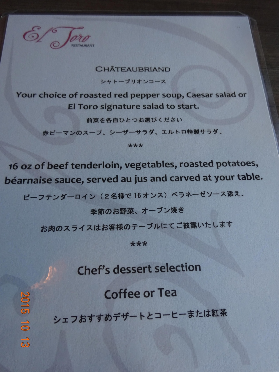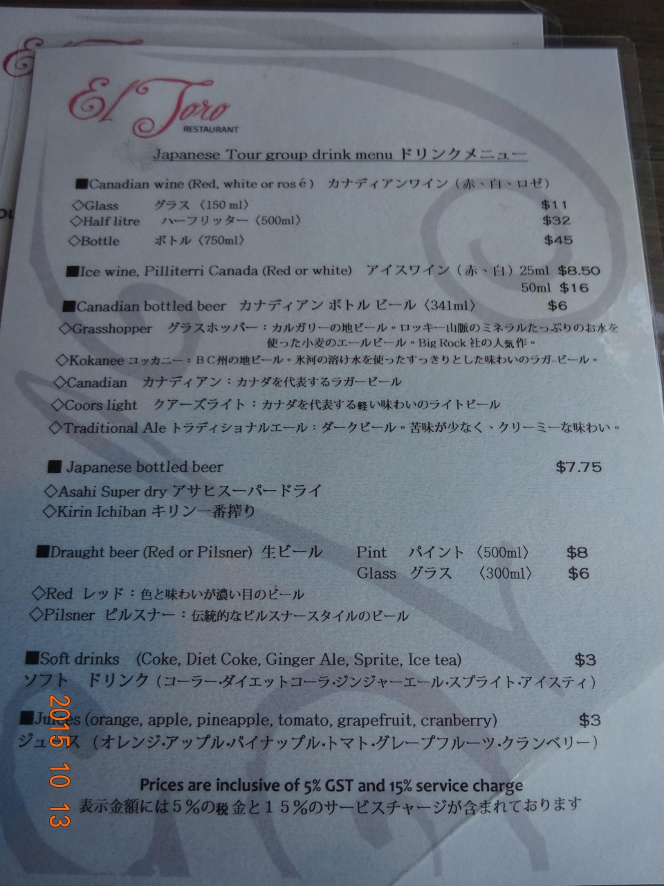 初め日本から旅行社を通じて時間と席の予約を入れていましたが、現地に着いてJTBのミールクーポンが二人でC$110であることを知りそちらを利用しました。