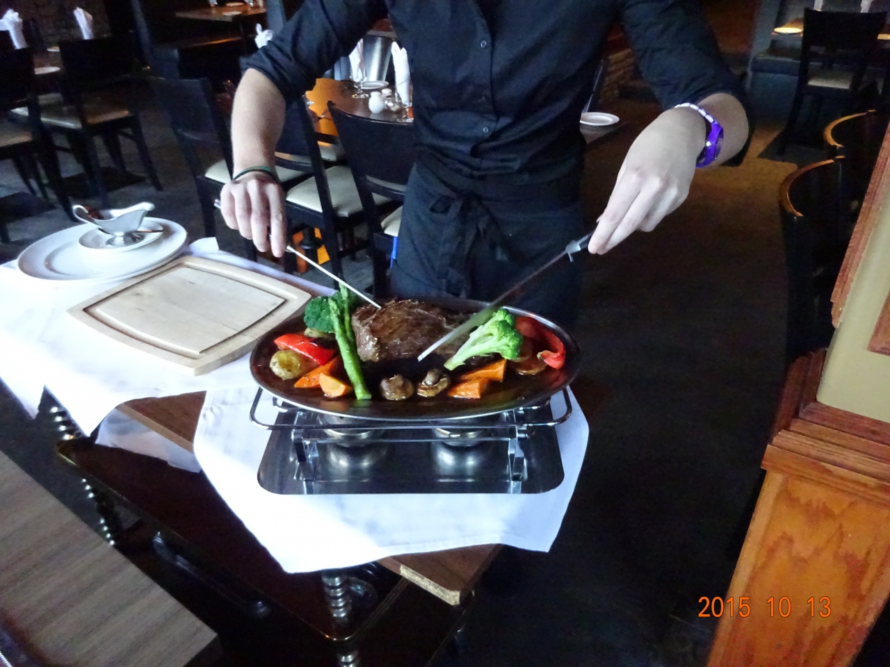 アルバータ牛のステーキといえば、バンフではプライムリブを提供するレストランが一般的ですが、こちらのお店はシャトーブリヨン(ヒレ肉の中央部で牛一頭から500gくらいしか採れないらしい)を二人で16オンスのまるまる1本状態で焼いてきて、テーブルでそれを切り分けてご披露というコースです。