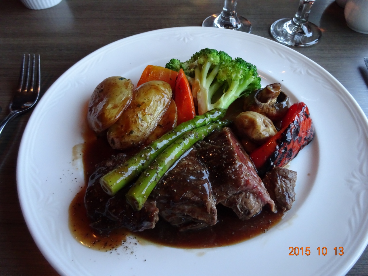 お肉は赤身なので、焼きすぎると硬くなりますから、切り分けでも火が入ることを考えてミディアムレアにしましたが丁度良かったです。お味は、塩コショウの効いたグレービーソースがメインソース。シンプルな味付けですが、さすがに一人3切れ230gは女性には多いかも。お肉はくせもなくとても柔らかく、付け合せのお野菜もこれでもかというほどボリューミー。焼きあがったお肉を切り分けてくれるサービスも食欲が増します。高級なアルバータ牛肉を堪能しました。