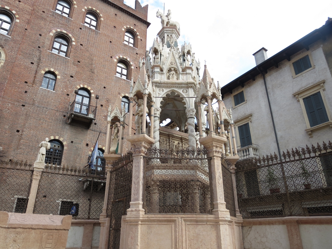 四方に人、顔、花、鳥のような動物などたくさんの石の彫刻があります。彫刻のほぼすべてが極めて精巧に作られています。ここまでの物を作らせるスカラ家の権力の絶大さが伝わります。通りから柵越しに見られなくもありませんが、下の部分が柵が邪魔をして見えづらいです。入り口に経つ係員に入場料として1ユーロ徴収されました。