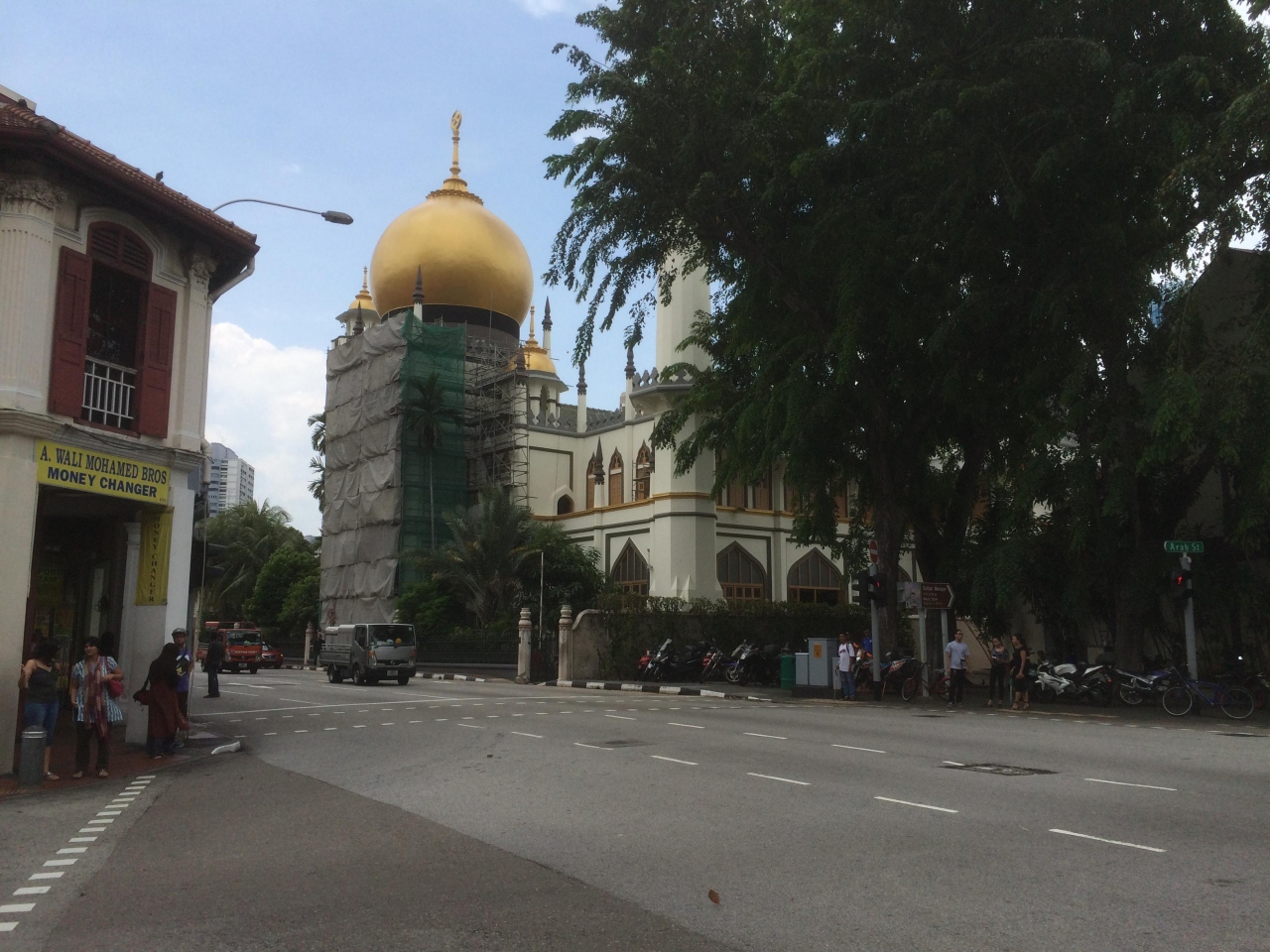 アラブストリートのシンボルで有名なので、ここに行かなくちゃ損だと思ってきたのですが、修繕中で、工事用のネットで一部がおおわれていました。それでも金色の輝くドームは見ごたえありです。