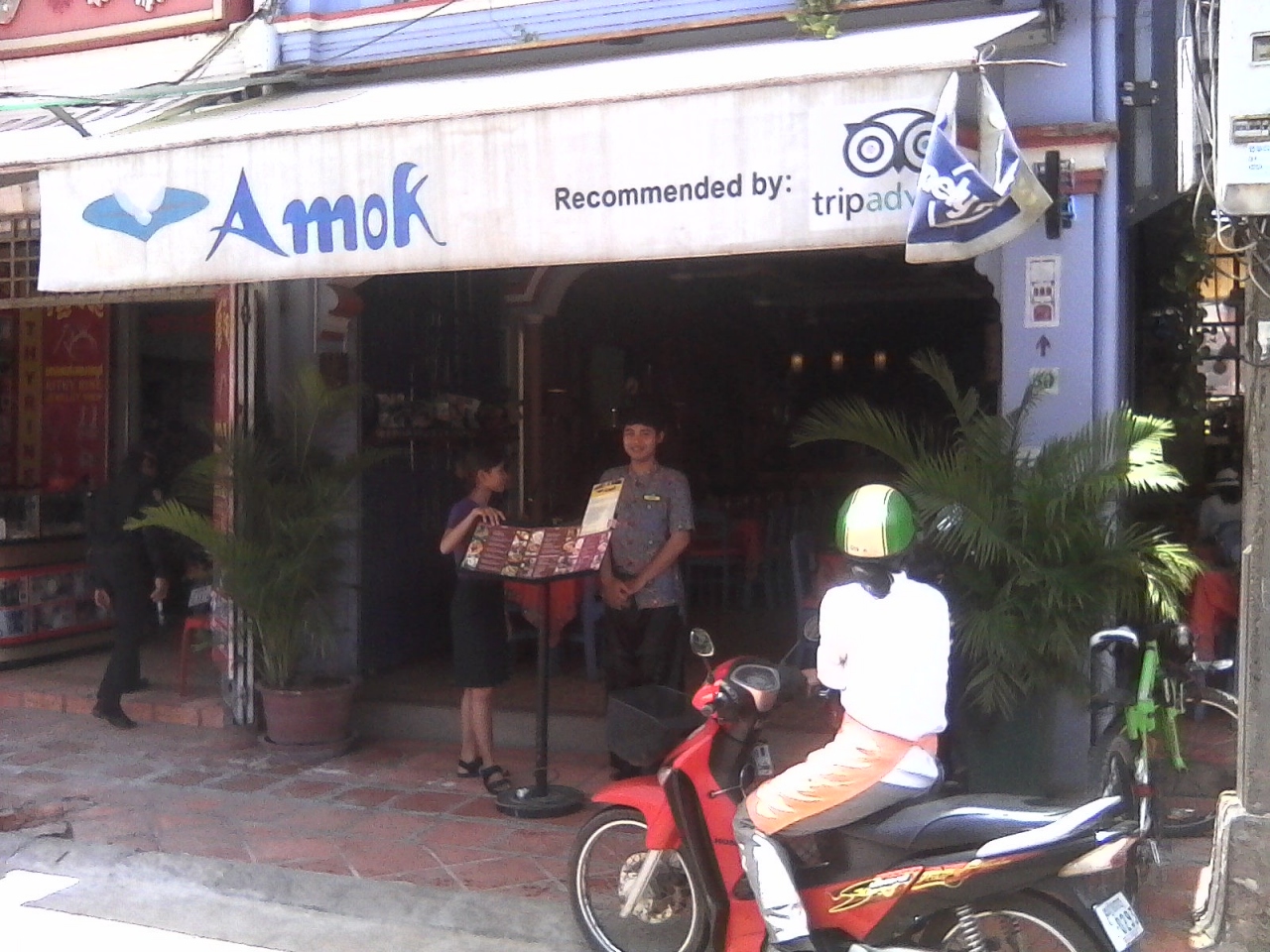 このアモックは、ザ・パッセージ通りにあるカンボジア家庭料理が食べられるレストランです。見た目はそんなに綺麗ではありませんが、看板のトリップアドバイザー推薦が印象的でした。客層は海外からの観光客が中心です。3品注文してみましたが、普通の盛り付けで、普通のカンボジア料理が出てきました。料金的に観光地価格ですので、他の地元食堂を利用したほうがお得だと思いました。
