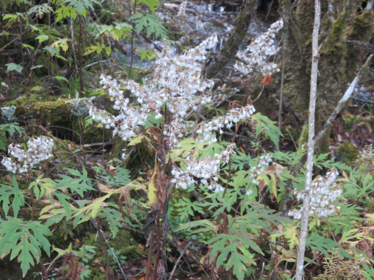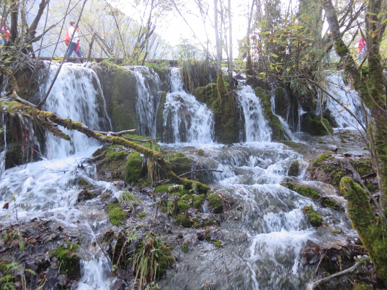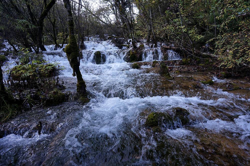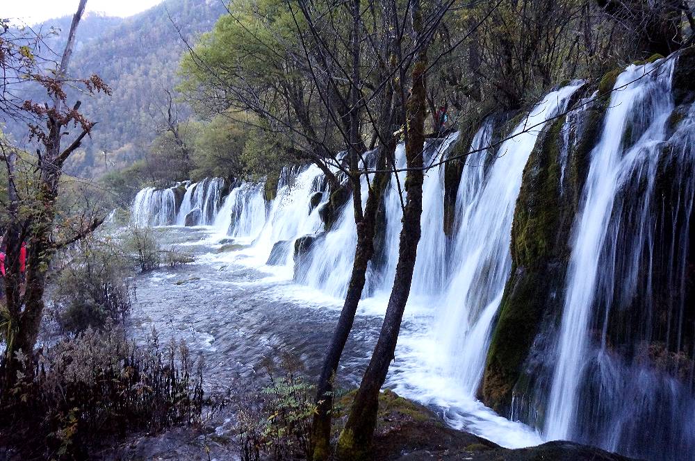 箭竹海から熊猫海へ行く途中で見られる滝。落差はないが、横に長く、一枚の写真に収めて撮るのはむずかしい。滝のそばの水辺には丈の高い白い花が咲き、暑いときには一時涼しい気分になります。滝の流れは途中でも小さな滝となって熊猫海に流れ込みます。