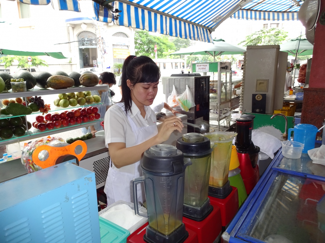 人気のバインミーは20000ドン ショーケースの上にいくつかの種類のパンがあるので指差しで注文します。日本語英語は全く通じませんでした。店内で食事も出来るのですが店内の各テーブルにメニューがあり裏面にフレッシュジュースが写真付きで英語表記されてます。指差しでメニューから注文、料金は選ぶフルーツによりますが20000ドンから25000ドンです。テイクアウトも出来ます支払いはジュースを受け取った時に支払います。お昼時に行ったのですが店内は食事をする地元の人たちで満席でした。地元の人たちでにぎわっているのですから食事も期待できそうです!次回は店内で食事もしてみようかと思いました。