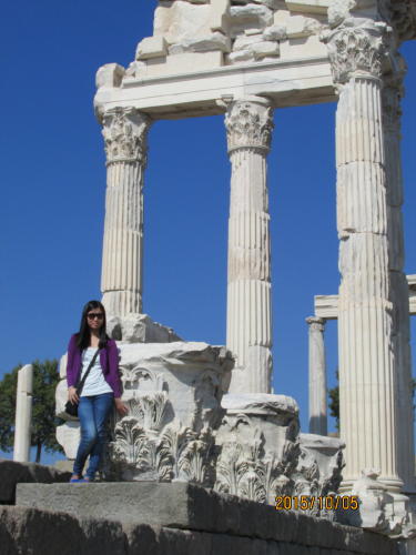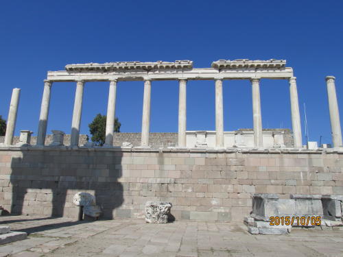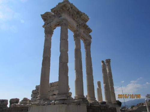 イリオスのトロイ遺跡からエーゲ海に沿って南下、230kmでベルガマです。ペルガモンは、紀元前3世紀半ばから2世紀にアッタロス朝の都として繁栄したヘレニズム時代の都市であります。ペルガマのアクロポリス遺跡は標高335メートルの丘の上にあり、一群の建造物で構成されています。山頂に宮殿、トラヤヌス神殿(ローマ時代のもの)、アテーナー神殿、劇場、ゼウスの大祭壇、アゴラ、図書館、武器庫の遺跡があります。出土品の大半はドイツベルリンのペルガモン博物館の内部に復原・展示されており、往時の雄姿を再現しています。結果的にはドイツに持って行かれてしっかり保管されたので良かったかもしれません。アクロポリス遺跡には白い大理石の円柱が復原されています。さすがドイツも大きな野外劇場は持って行けなかったので現場に残っています。アッタロス朝では本の作成が盛んで、紙の材料のパピルスをエジプトから輸入していたが、エジプトがパピルスを輸出禁止にした為、羊皮紙を開発した。0.4mmの薄さで、丈夫です。現在は洋服生地に活用し、軽くて丈夫な点を活かしています。布地の洋服より高価です。