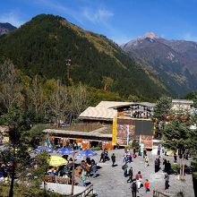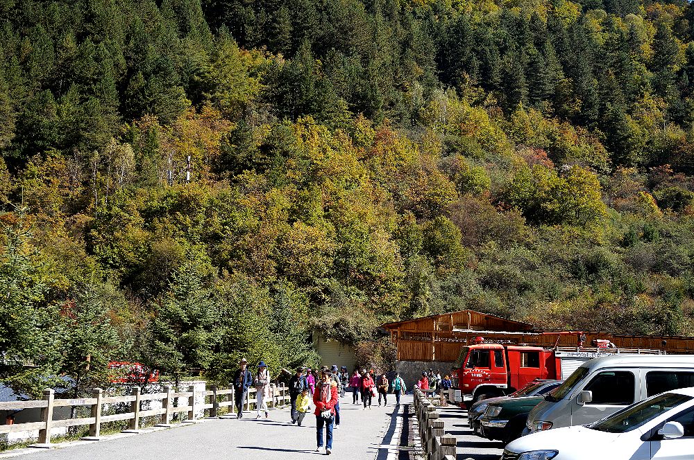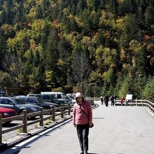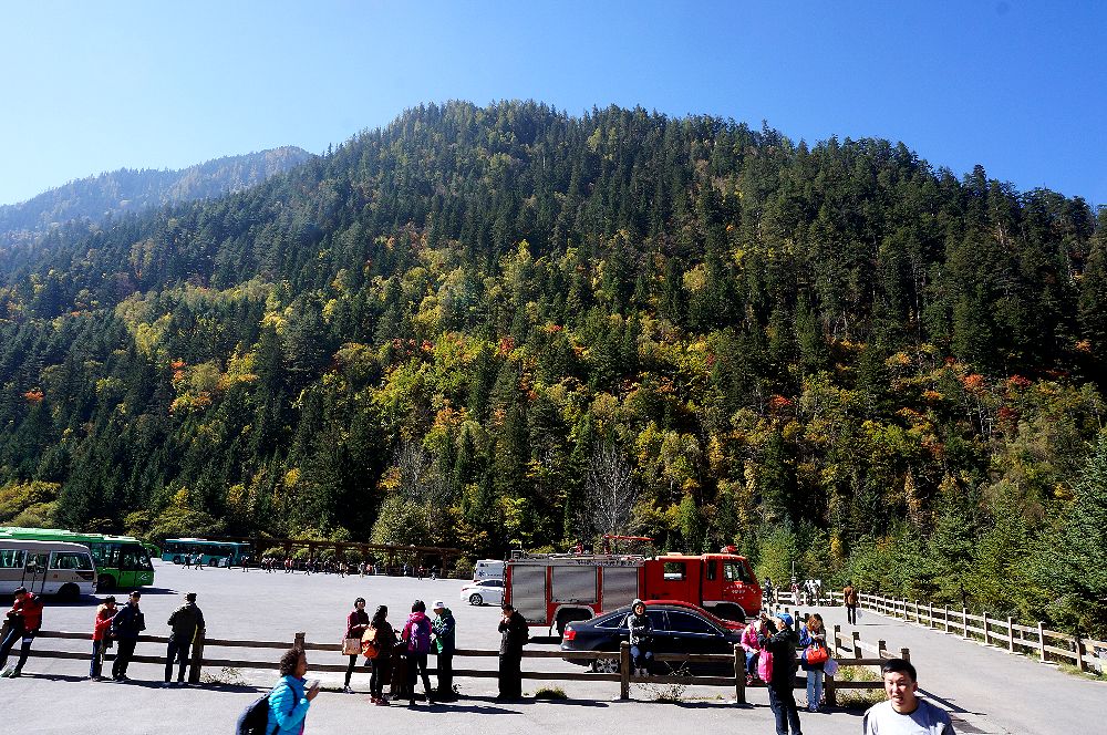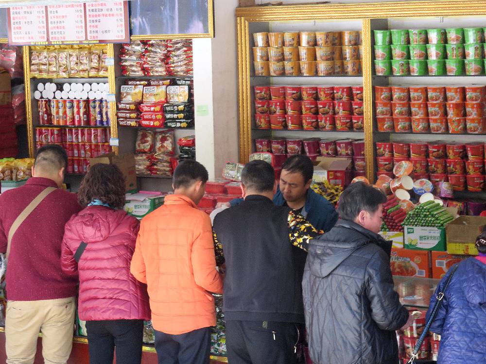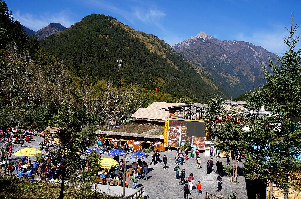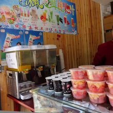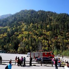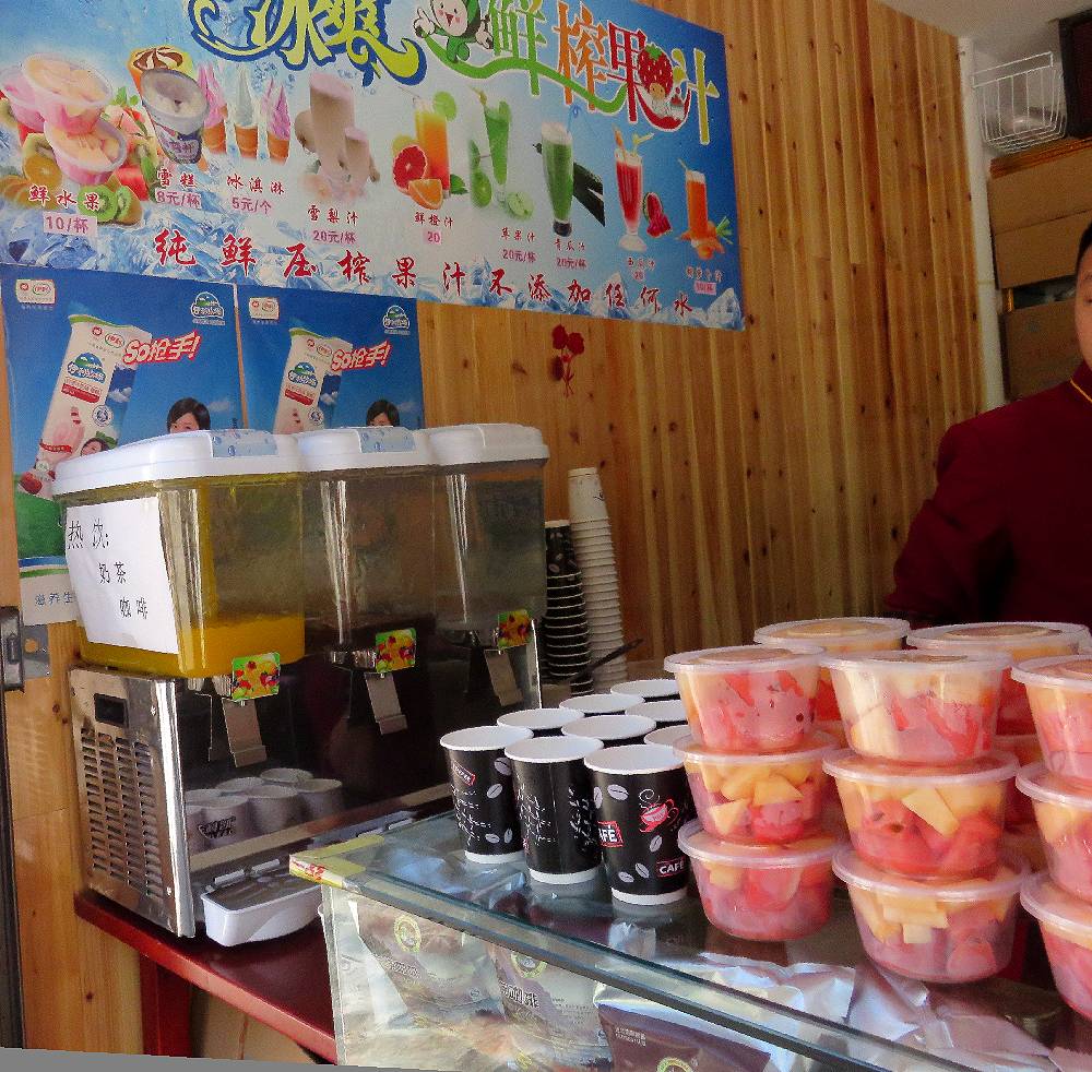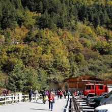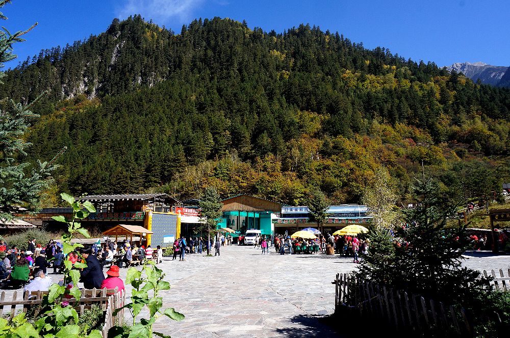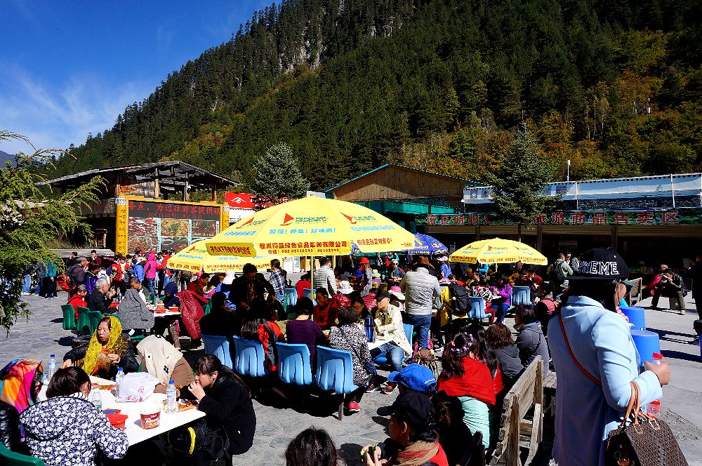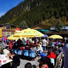 九寨溝2日目は諾日朗瀑布を訪れる前にここで昼食を食べました。ちょうど昼食時間帯だったので、長海からのバスを降りて、売店の立ち並ぶレストラン前の広場で椅子に座って食べようとしましたが、中国人観光客で椅子は占領されていました。しかたなく、売店でスイカとメロンのパック詰め合わせを200円で購入し、持参したパンと一緒に土手に座って食べました。中国人たちは売店でカップラーメンなどを買って、思い思いに食べていました。日本人のツアー客はレストランのビュッフェを食べると聞いていましたが、広場の売店にはおいしそうなものが売られていましたので、お腹の心配のない人はここで買って食べてもいいかも知れません。果物の詰め合わせは甘くておいしかったです。なお、早朝長海方面のバスに乗り換えるとき、広場を通る階段は通れません。上のほうにあるバス停まで車道を迂回しなければなりませんので、注意が必要です。