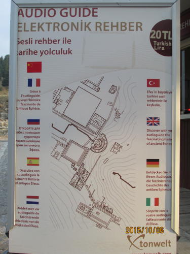 1、入口 2、水の宮殿 3、国営アゴラ 4、ヴァリウスハマム(公衆浴場)5、バシリカ 6、小劇場(オデオン)7、プリタネイオン (コンサートのビル) 8、ドミティアン神殿、9、メムミィウス記念碑、10、ヘラクレスの門、11、クレットレル通り、12、トライアン チェシメ(給水場)、13、急斜面の邸宅群、14、ハドリアヌス神殿、15、スコラスティカ ハマム(公衆浴場)、16、公衆トイレ、17、娼館、18、マゼウスーミフリダテス門、19、セルスス図書館、20、大理石通り、21、商業アゴラ、22、大劇場、23、劇場ギムナシウム、24、港通り、25、港ハマム、(公衆浴場)、26、聖母マリア教会、27、スタジアム通り、28、スタジアム、29、出入り口。皆様は先に入り口で購入し、ガイドブック片手に見て廻る事をお勧めいたします。