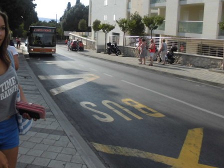 郊外のバス停の目印は路上の黄色い「BUS」の文字。 ドブロブニクカードで乗車可能です。