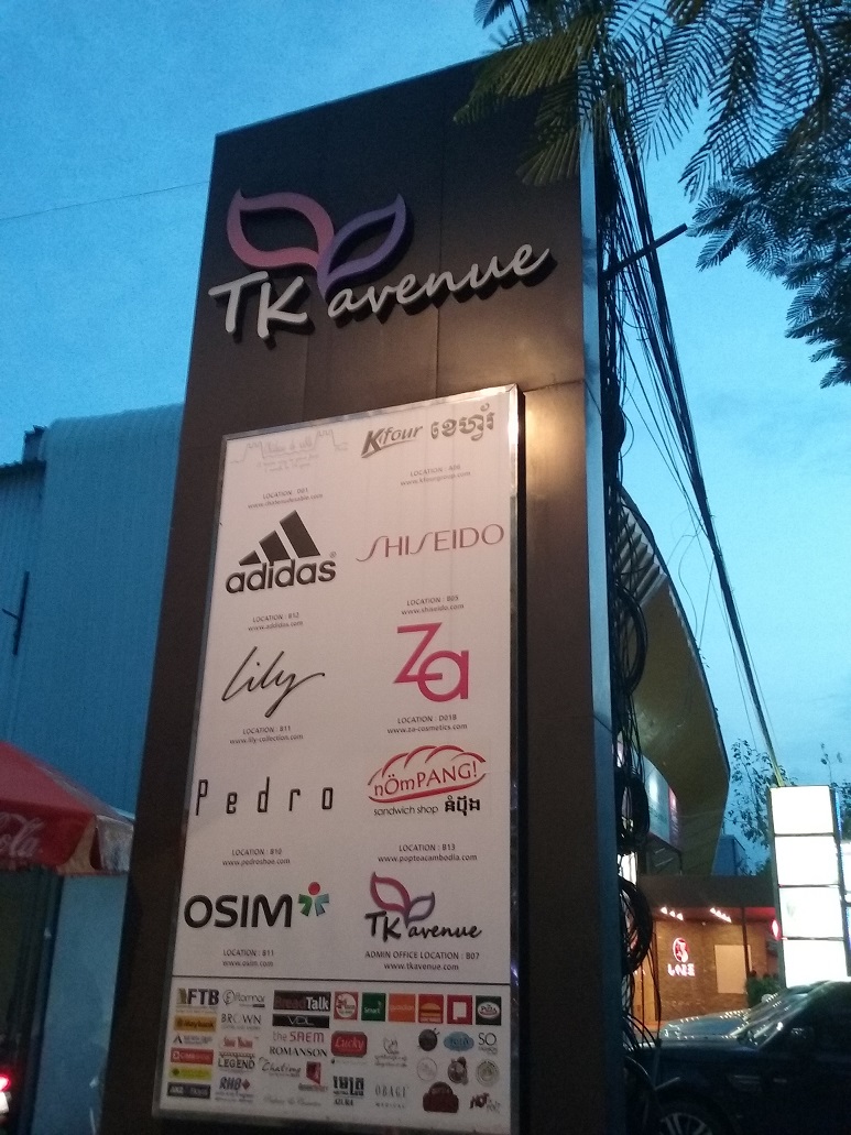 プノンペンの中心から北西に位置するトゥールコック地区は、高所得者の住まいや大学などが集まる新興地区です。扇を広げたように放射状に広がる街の、丁度要になる部分にあるのが、新しくできたTKアベリューというショッピングモールです。ラッキースーパーという輸入食材・高級食材を扱うスーパーや映画館、レストランが集まります。日本でいる100円ショップ(プノンペンではUS$1.9が基本)も隣接して店を構えていますし、このエリアにご用の際には立ち寄ってみては如何でしょうか?