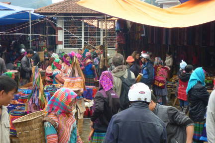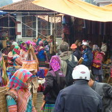 朝6時にラオカイのホテルを出てバスターミナルへ向かいました。バック・ハー行きはすぐに出発した二時間で到着しました。しかしバスは地球の歩き方の地図とは違うターミナルに着いたようでバックハー市場が見つかりませんでした。しばらく迷い、歩いている人について行ったら無事に到着しました。サパ市場と異なりかなり華やかでした。水牛の市が見たく水牛についていくと、市場の中の丘の上に到着。水牛の市と丘の上からの市の様子を眺めることができました。豚がビービー言いながら袋に詰められて売られていく様子や、犬が売られている様子がかなり生々しかったです。