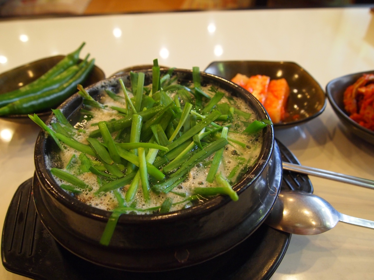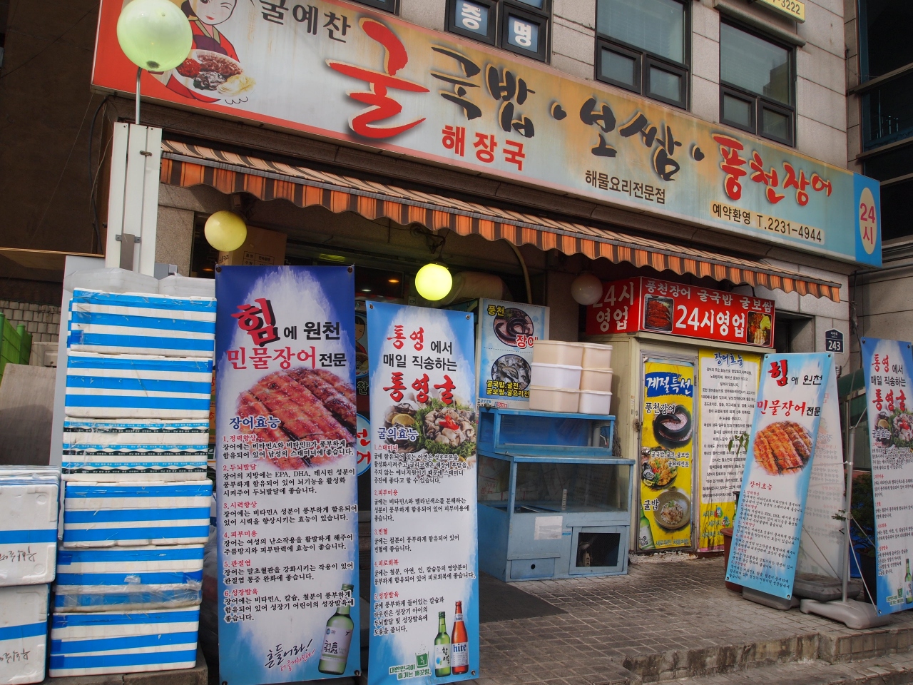 地下鉄「新堂」7番出口を出てすぐ目の前にあります。海鮮料理がメインのお店で、朝食にクルクッパ(カキの入ったクッパ)を食べました。カキとニラがどっさり入っていて味も食べ応えも十分です。これで6,000ウォンはお得です。24時間営業なので便利だし、店内も広く座れないことはまずなさそうです。ひとりご飯の客も数人いたので、一人旅の方にもお勧めです。