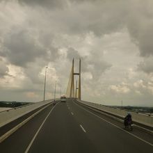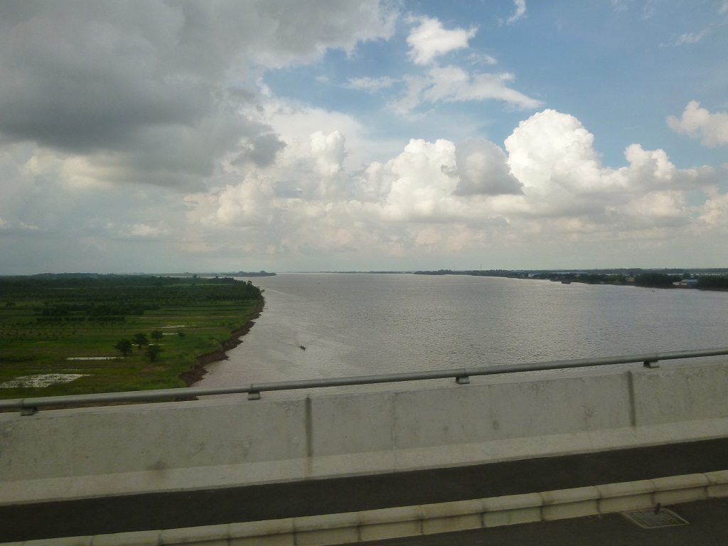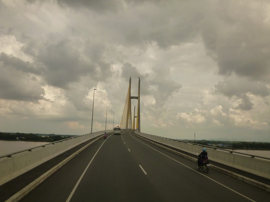 タイからカンボジアのプノンペンとベトナムのチーチミンを結ぶアジアハイウェイの要衝であるメコン川を渡る橋です。2015年の4月に日本の援助でこの橋が開通する前は、渡し舟に車ごと乗って川を渡っていたそうです。時間は大幅に短縮されたとのことですが、それでもカンボジア側の道路状況の悪さもあって、プノンペン/ホーチミン間は8時間ほどを要します。