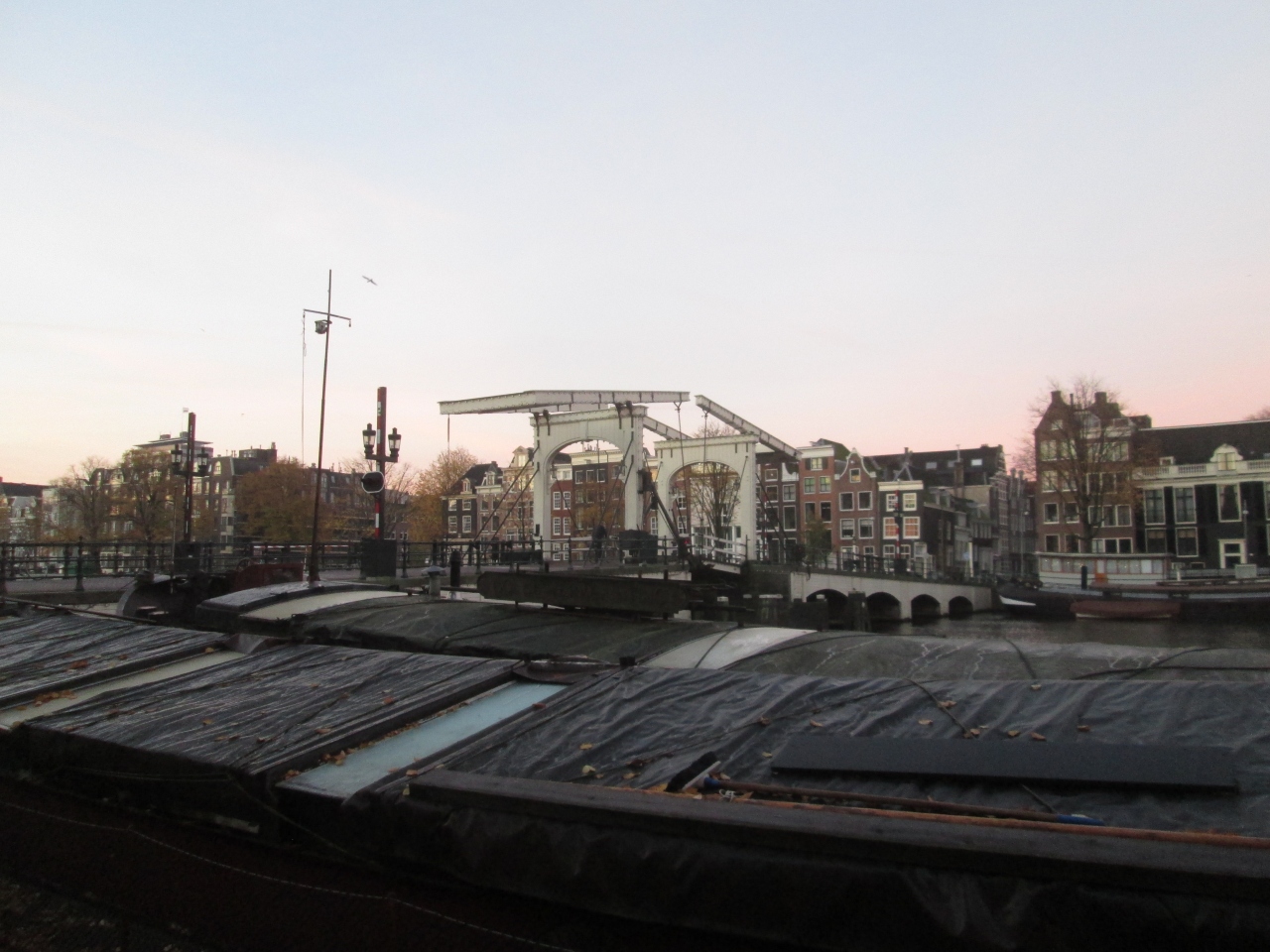 オランダ出身のゴッホが描いた「アルルのハネ橋」を思い起こさせるこの橋は、アムステルダムに残る木製のハネ橋のひとつです。アムステルダムにはこういった橋が残っており、近くにも似たような橋がありました。運河の町ならではの光景です。
