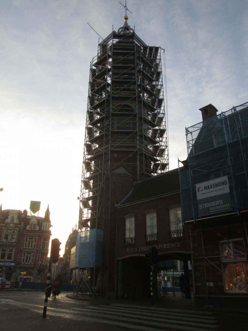 17世紀にアムステルダムの町が大発展を遂げると、それまでシンゲル沿いに町を取り囲んでいた城壁は取り払われました。その残った塔の上に時計台を付けたのがムント塔です。10月に訪問したら改装工事中のようでした。