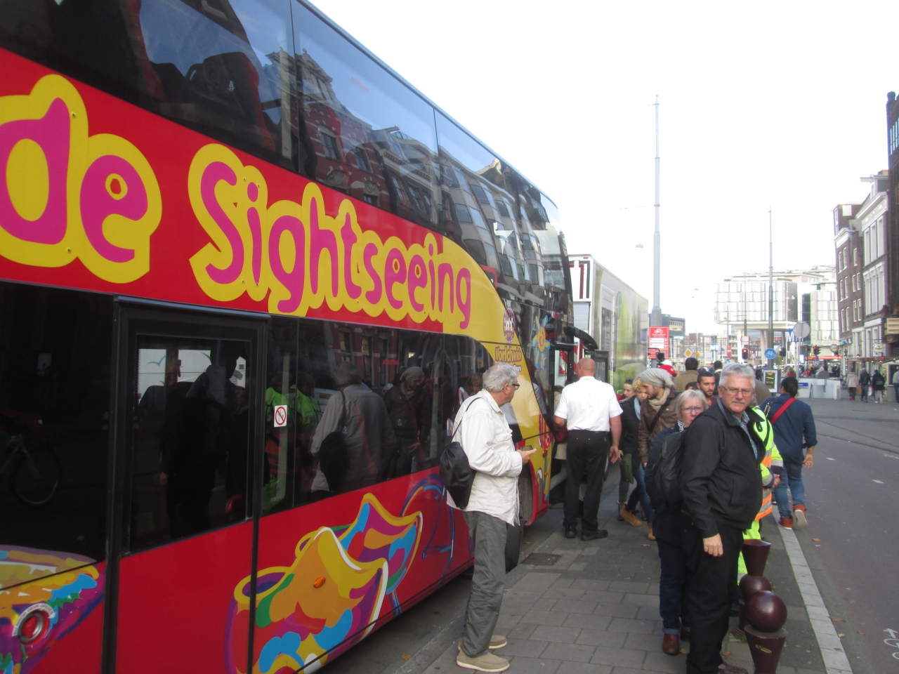 アムステルダム市内の主要観光スポットを回る観光バスに乗車しました。2階建てのバスで、各座席にはイヤホンを差し込むと英語をはじめとする言語のガイドが聞けます。日本語もありました。平日でしたが座席はほぼ満席で人気のバスでした。