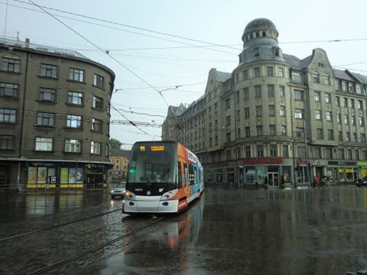 リガのトラムは、道路の真ん中に止まるので、歩道とトラムの間に車道があって、トラムが止まると隣を走っているトラムも止まる形になります。