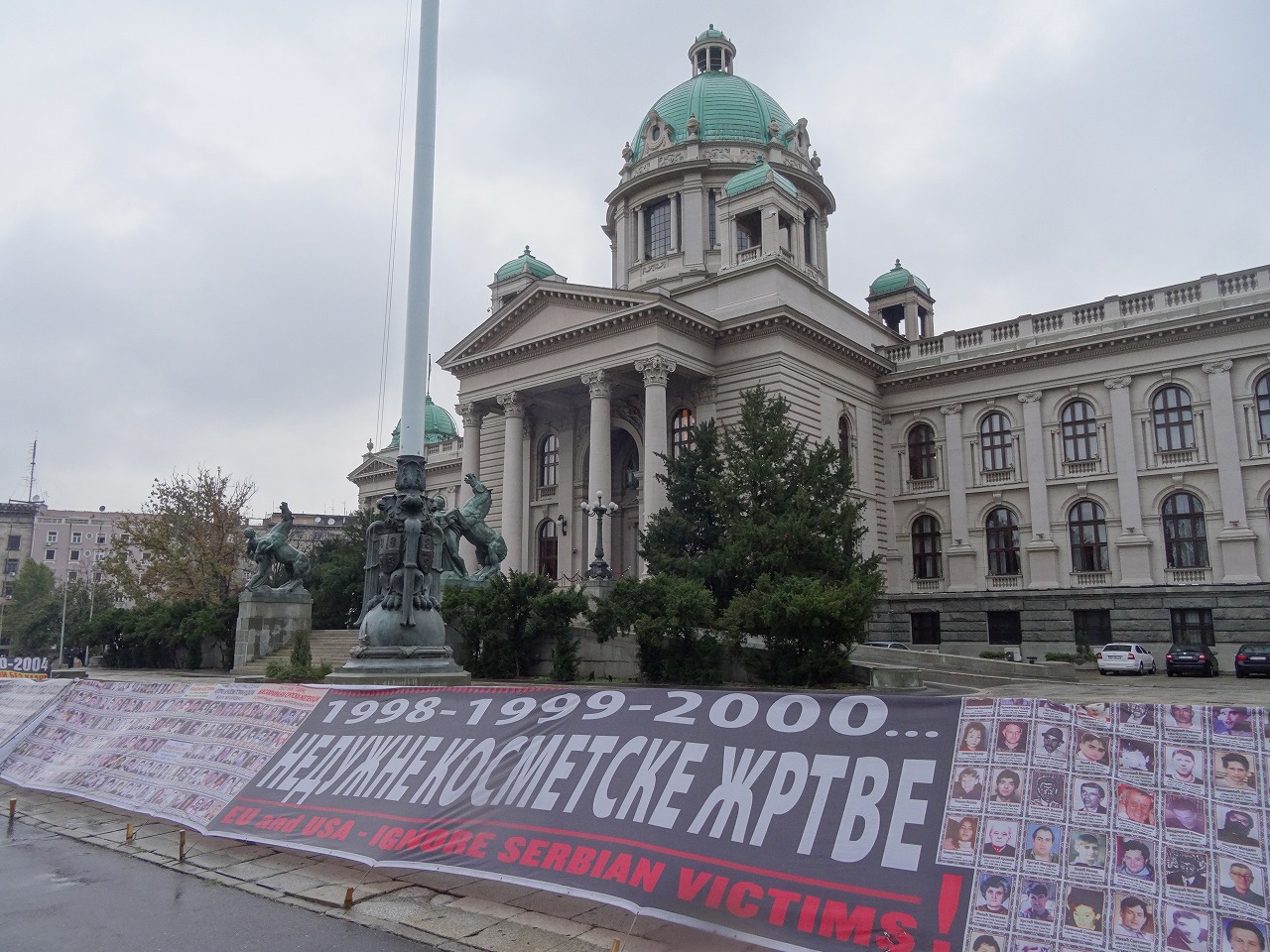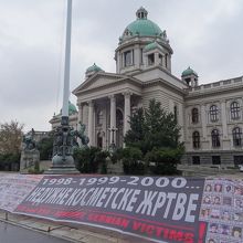 ★セルビア ベオグラード「国会議事堂 (National Assembly )」 国会議事堂の前では、戦争によってなくなった人たちの顔写真を載せた布が広げられ、戦争反対の運動をしていました。一見、平穏なセルビアですが、空爆通りのNATO攻撃跡もそうですが、悲しい戦争の傷跡は、消えていません。消さないのがこの国の姿勢です。