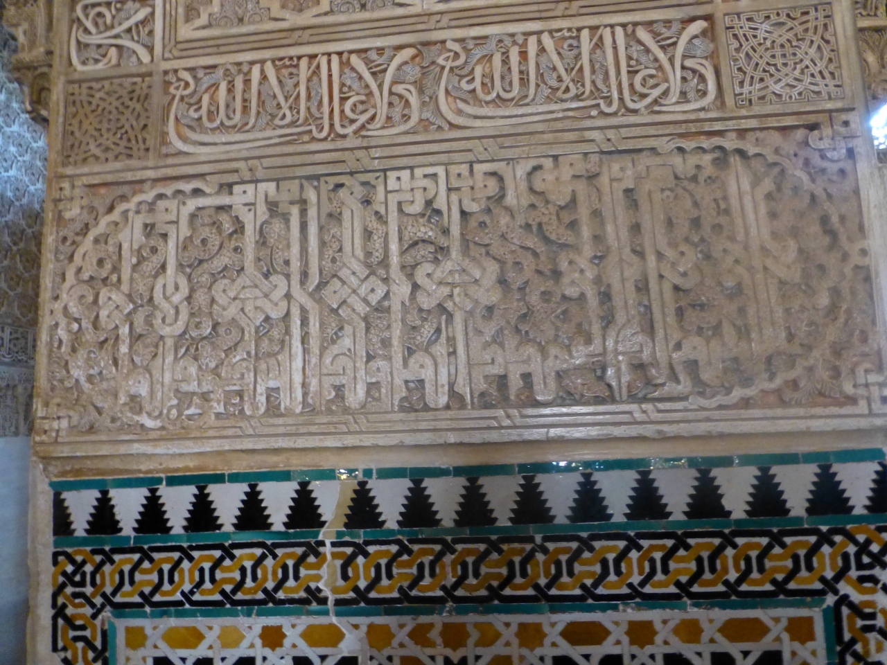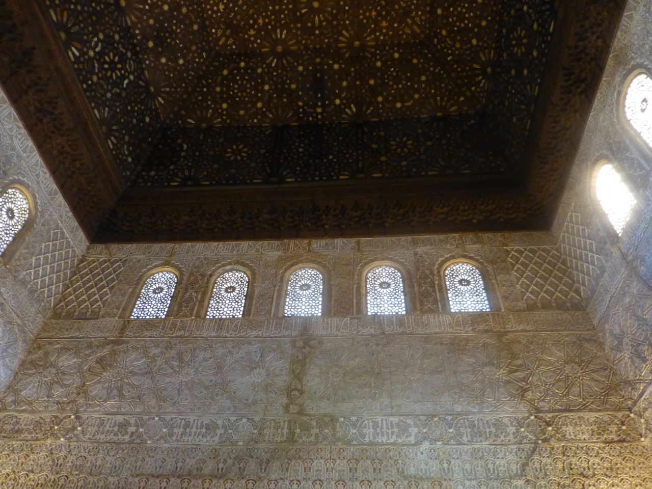 ナスル朝宮殿・コマレス宮の`大使の間`です。はめ殺し窓はモザイク模様で この薄暗くてのサロンは、使節団が王に挨拶するのは困ったことですよネ(^o-)(もっとも 王の狙い?)。高い天井と四方の壁一面はアラベスク様式の装飾美です!