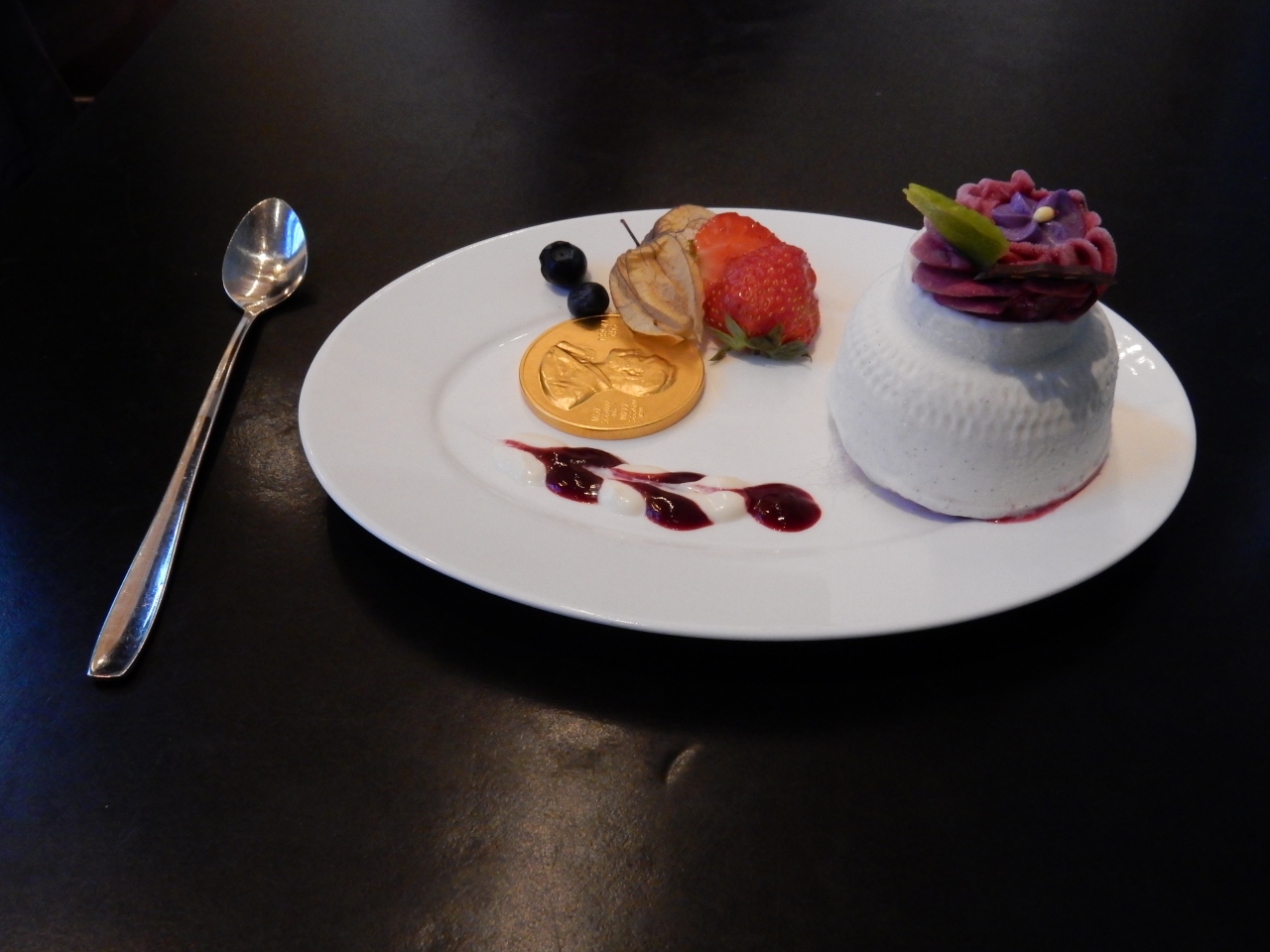 バニラアイスの上にグレープのシャーベットが乗っており、ゴールドメダルのチョコやイチゴなどで装飾がされたアイスプレート。