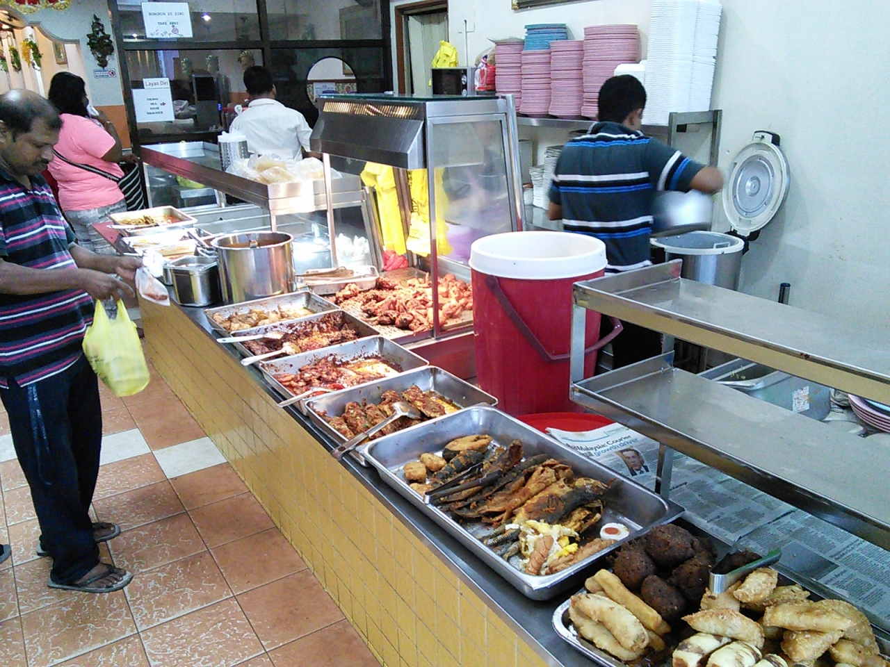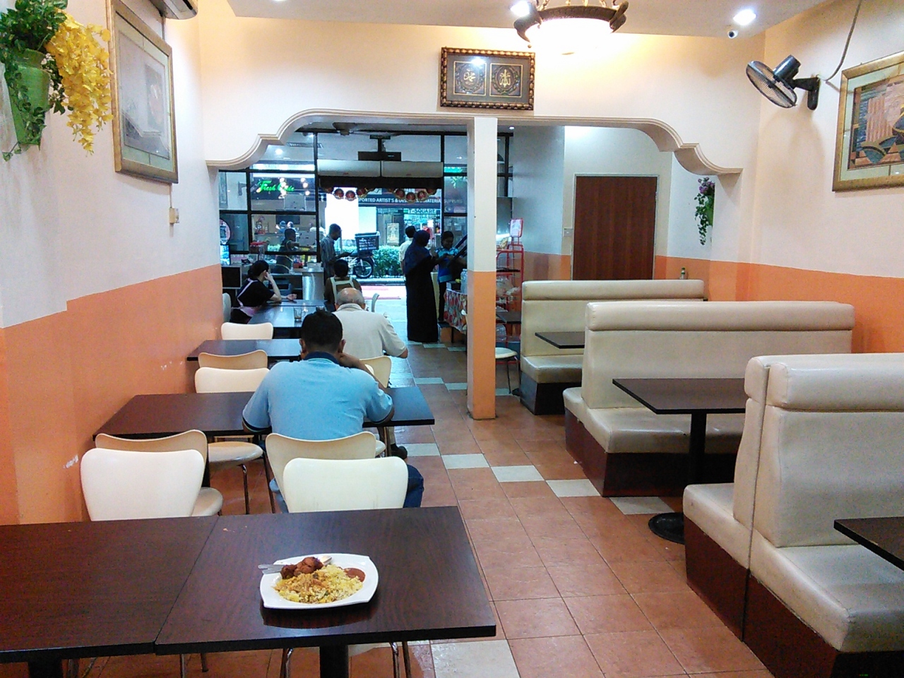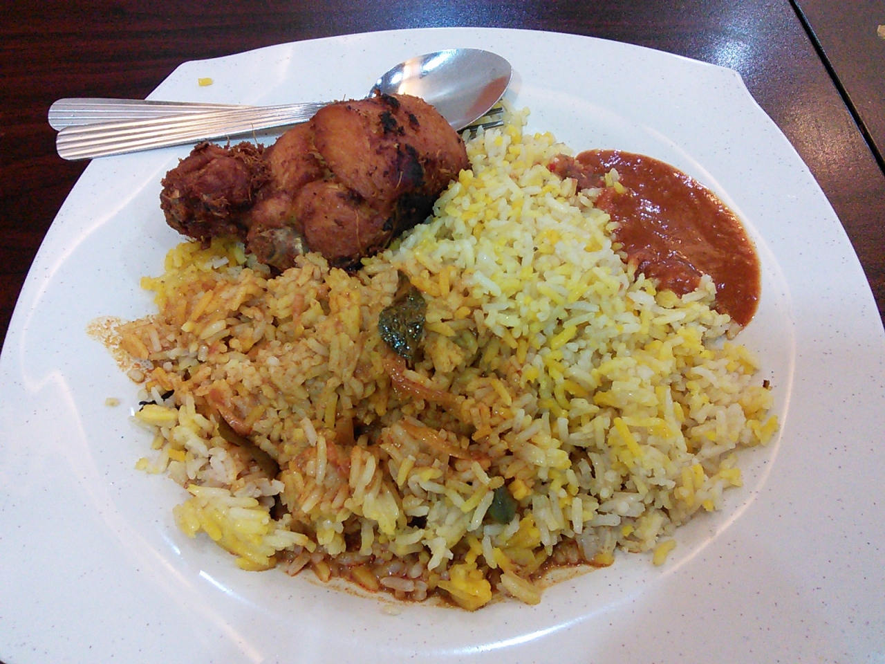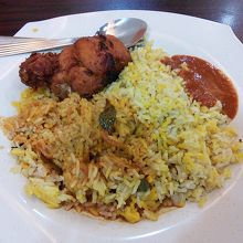店名のとおりビリヤニが食べられます。まず入口外のおかずが並んでいる所で注文をします。持ち帰りの人もいるので店内で食べると告げれば皿に盛ってくれます。基本形はご飯(ビリヤニですのでもちろんスパイスで炊き込んであります)とアヤムゴレン(フライドチキン)です。これで6RM。野菜や卵などの副菜を添えたり、魚に変えたりもできます。もちろん料金はかわります。私は“基本形”をオーダー。その場で受け取りカレーと(お好みで)サンバルをかけ店内へ。