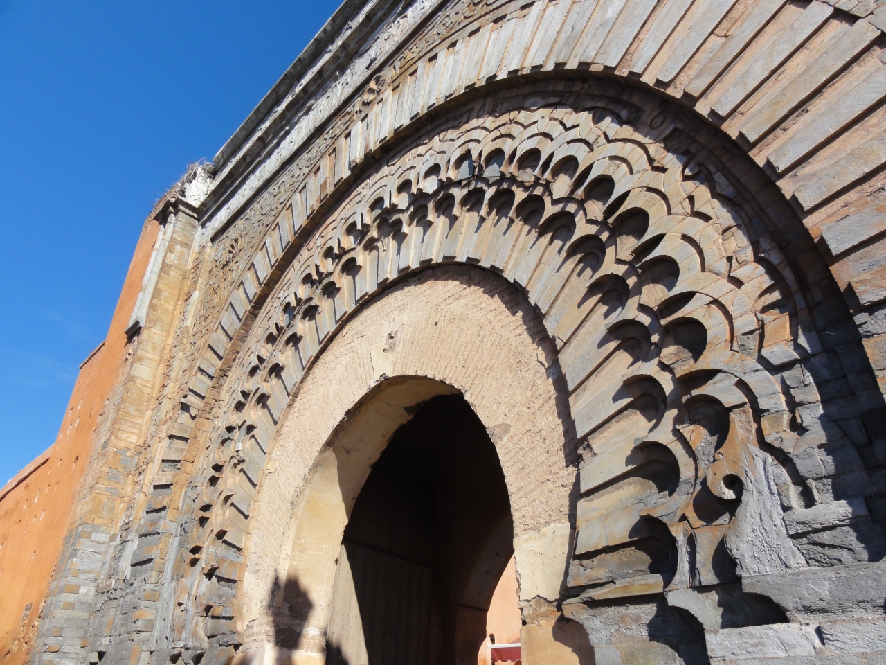 マラケシュ旧市街は城壁に囲まれているのであちこちに門がありますが、中でもこの門は立派です。良く見ると細かい模様がぎっしりと彫られていてとても美しい。ただ門の外は車が多いので離れて写真を撮りにくいので要注意。