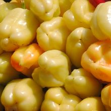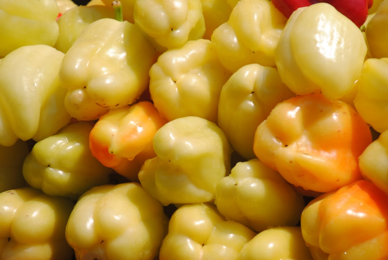 地元の買い物客で賑わう青果市場。色とりどりの野菜や果物が売られています。