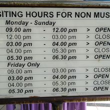見学者専用の入口にはしっかりとインフォメーションカウンターがあり非モスリムの旅行者でも心配ありません。もちろん肌の露出の多い服装では入場不可ですがそれ用の衣装を無料で貸し出しています。見学は無料。後でドネーションを求められることもありません。それどころかデーツ(ナツメヤシの実)と水の無料サービスもありました。インフォメーションの人はとても気さくで気持ちのよい対応を受けます。毎日見学できますが礼拝の時間はクローズとなります。詳しくは写真の表を参照して下さい。