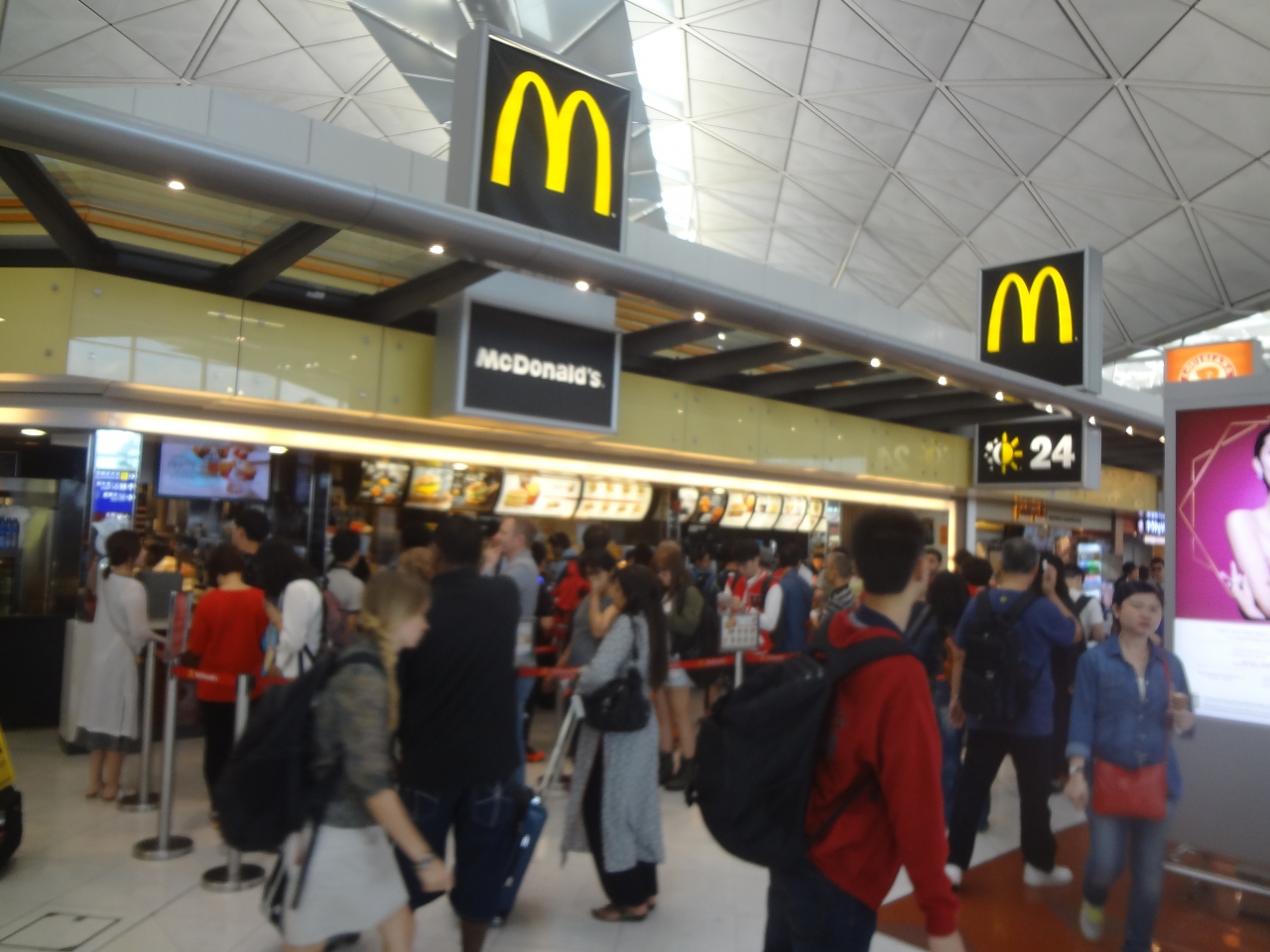出国審査を抜けた先のフードコート内にあるマクドナルドです。世界共通のマックだけに大人気のようで、購入するのに長蛇の列です。他にもお店があるのに。きっと割安感もあるのでしょう。購入後はフードコート内のテーブルに座っていただきます。