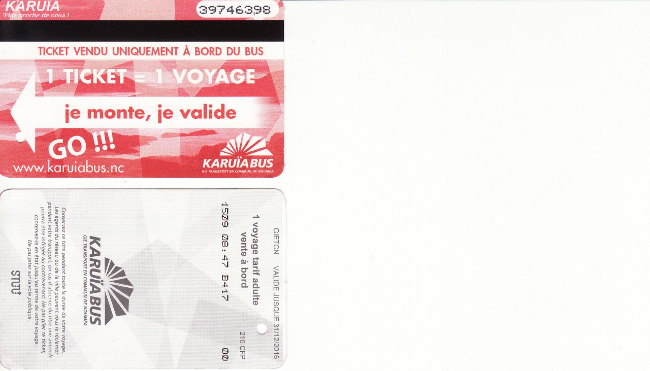 ヌメアを中心とする島内バスで、番号によって乗り分ける。我々が滞在するアンバスタからはヌメアまでは10または11番に乗る。切符は乗る前に運転手に行き先をいい現金で払う。ちなみにヌメアからアンバスタまでは210CFP(カレドニア・フラン)で約220円位でした。本数も20分に1本通り便利です。