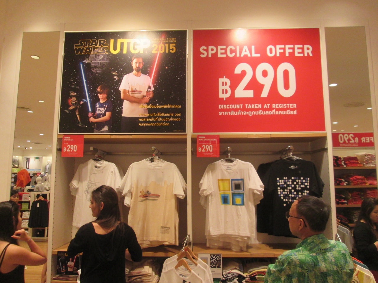 最新作「スター・ウォーズ」の公開を記念してユニクロのオリジナルプリントTシャツが販売されていました。バンコクでもスター・ウォーズが人気のようで、店内で期間限定の商品をディスカウント価格で扱っていました。