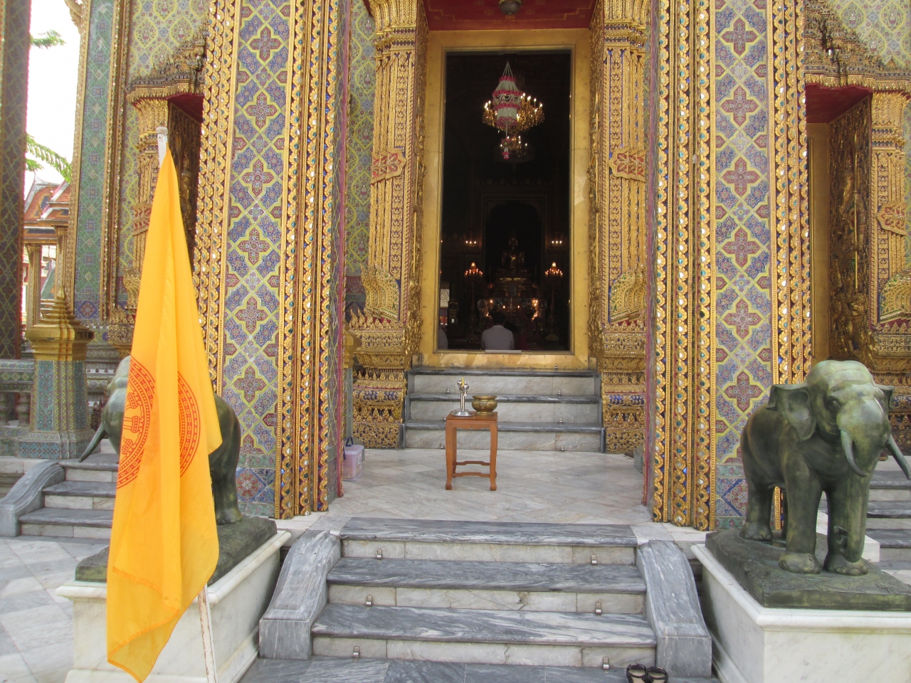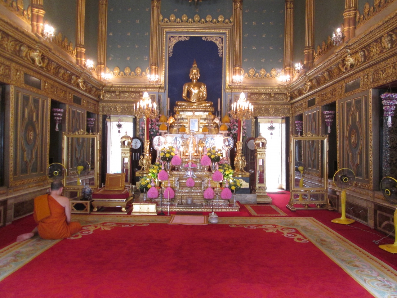 外壁には中国製タイル、窓には象嵌細工が施された本堂です。本堂内部にはシャンデリアがつり下げられており、ラーマ5世の洋風好みを感じさせる造りになっています。中に入ると熱心に参拝している人たちがいました。