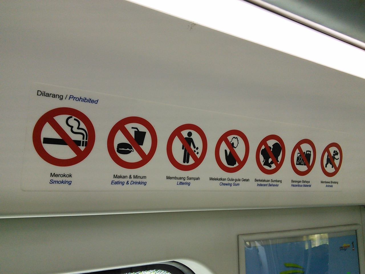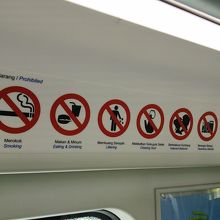 車内は清潔で涼しく快適そのもの。車内の注意書きには飲食禁止(水はOKのようです)、チューイングガム禁止などの他にキス禁止の表示も、カップルでいちゃつくなと言うとこでしょう。マレーシアらしいです。