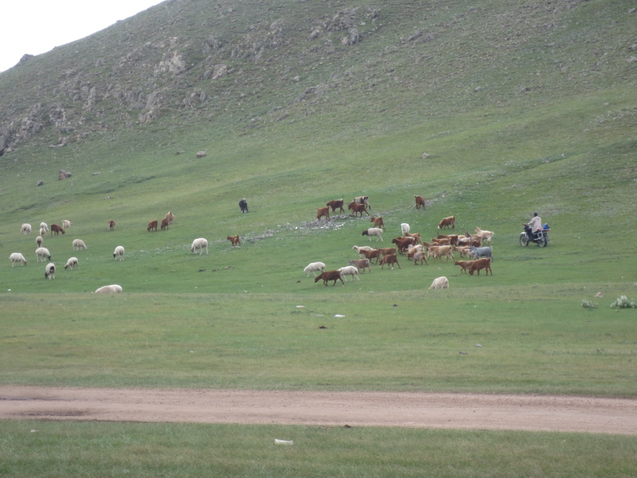 ガイドからテントに入ったら家畜の乳から出来た乾燥したヨーグルト(チーズ?)が出るが絶対一口は食えと言われましたが、それは無理なく食せました。ただ、入口横にはバイクが置いてありましたし、テント内にはスーツがハンガーで掛けてあり少し興ざめしました。その後、日本でいえば中高生程のお兄ちゃん(乗馬中は煙草を吸うか携帯で電話ばかり)の先導にて周囲の草原を1時間弱乗馬しました。広々とした草原を馬でゆっくり進むのは最高に気持ち良かったです。