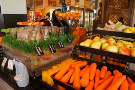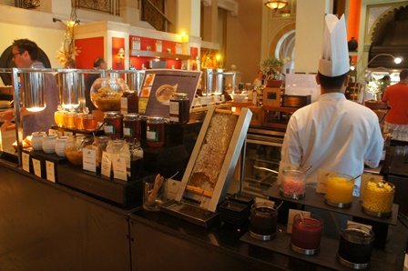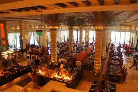 アルカスルに滞在していて朝食に利用しました。豪華な雰囲気で朝食をいただけますが時間によっては混雑しています。パンや卵料理などは同レベルのホテルでは普通の食事で特別めずらしいものはありません。フルーツやジュースが充実していて、ハチミツの種類が多かったです。野菜は少ないように感じました。アルカスルに滞在するとミナ・アッサラ−ムなどでも朝食もできますので、日によって変えてみることをおすすめします。