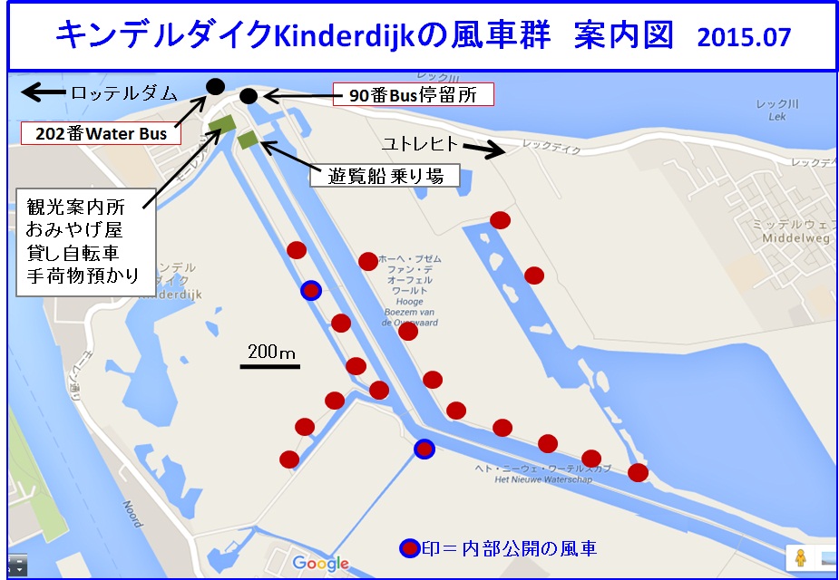 キンデルダイクKinderdijk風車群の観光地図 (2015年7月)
