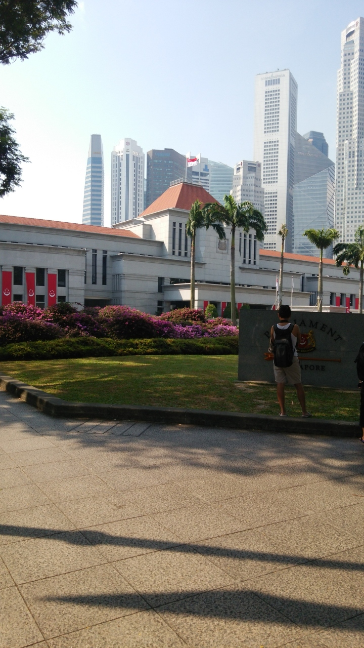 シンガポールの中心部にある国会議事堂です。他のシンガポール建築と同様のデザインで、オレンジ色の屋根が綺麗ですね。行った時はちょうどシンガポール建国50週年記念を祝っておりましたので、赤い垂れ幕が飾ってありました。草花の緑が多いのも特徴ですね。