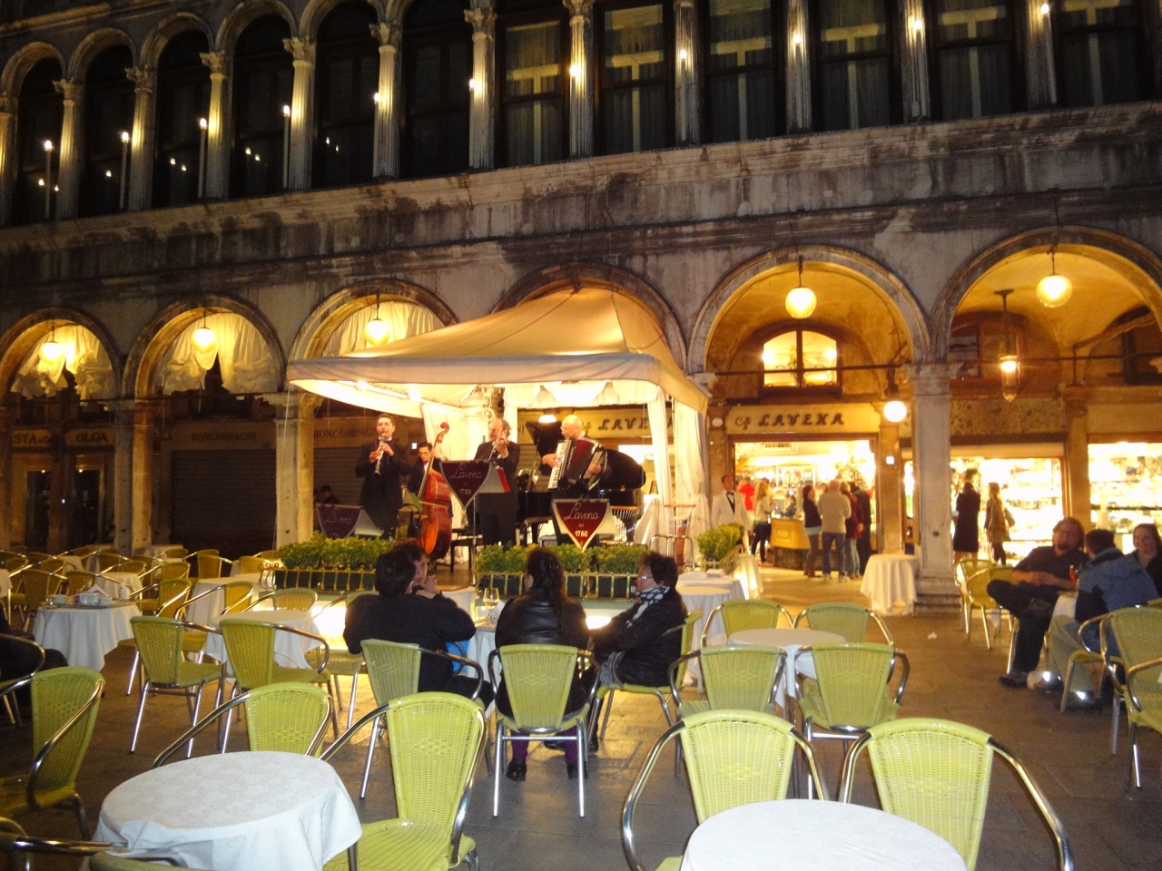 ヴェネツィアのシンボル、サンマルコ寺院などがある中心の広場なので、いつも大勢の人で溢れています。有名なカフェフローリアンをはじめ、沢山の飲食店や土産物店、ホテルなどが周囲に立ち並ぶ便利な場所ですが、私は夜至るところで繰り広げられる音楽の生演奏がとても気に入りました。