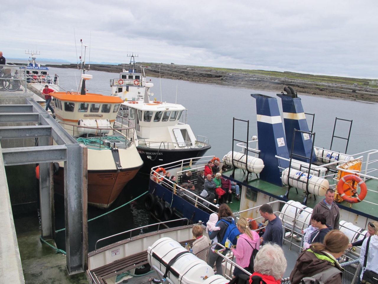 私は、ドゥーリン10時発の小型船で行き(20ユーロ)、帰りは17時発のロッサヴィール港+送迎Busでゴールウェイへ行きました(17ユーロ)。