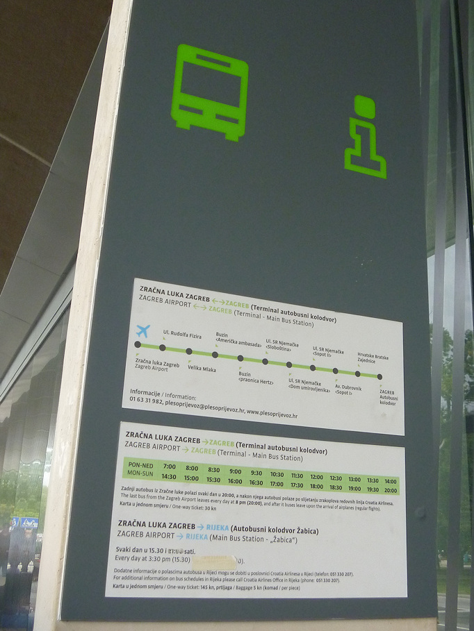とても小さな空港です。入国審査を済ませて到着ロビーに出た所すぐにATMがありました。市内へはだいたい30分おきにバスが出ていました。バスに乗ってから料金回収がありました。30クーナ(訳540円)。40分ほどで、街の中心地に到着できます。