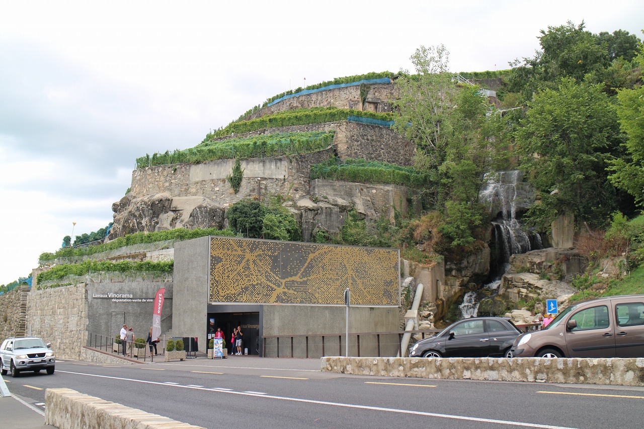 2007年にユネスコの世界文化遺産に登録された「ラヴォーの葡萄棚」を訪れようと、特に下調べもせずレマン湖の湖岸沿いの道を走ってたところで見つけた施設。名前が「ヴィノラマ」となっていたので、「もしかしてパノラマで葡萄畑が見られるのか?」と、期待感持たされる名前に引き寄せられた。