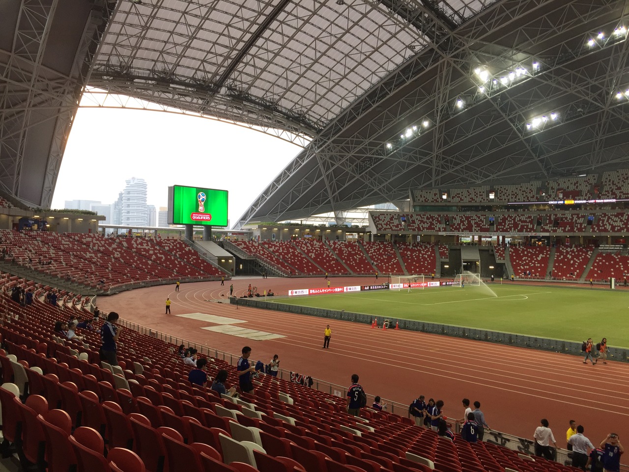 サッカーワールドカップ二次予選シンガポール戦を観戦してきました。スタジアムのアクセスはMRTのスタジアム駅直結かカラン駅は徒歩10分程です。施設は最近出来たばかりなので綺麗な造りになってます。サッカー専用スタジアムではないので客席からピッチは離れておりますが、サッカーを見るには困らないと思います。ただチケットが全席指定でしたので予約時に応援で盛り上がる位置が分からないので少々困りました。チケットはシンガポールスポーツハブのWEBサイトから直接購入が出来ます。(要会員登録有り)