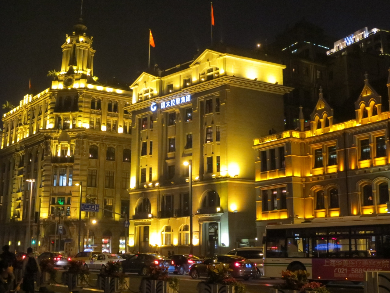 上海といえば外灘というくらい一度は見ておきたい風景です。たくさんの人が記念撮影を楽しんでいます。色とりどりの対岸のビルの夜景、手前の黄金色に照らされたビル群、どちらも見ても旅の記念になると思います。舗道も広いので、安心して歩くことができます。