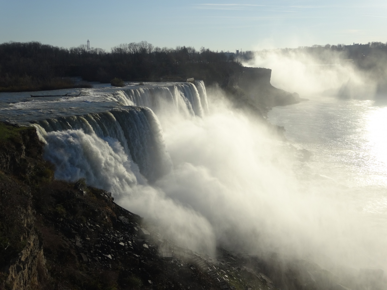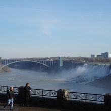 カナダ側からや船からそして、アメリカ側からアメリカ滝をみました。カナダ滝に比べると迫力が落ちる感じがしますが、カナダ滝より、霧が出ていないので、近くでも写真が撮れて良かったです。公園は、開放されているので、展望台や、滝の下に降りて見ている人もいます。冬になれば、滝の一部が凍ってまた、違った感じになるそうです。こちらからカナダ滝も見えるしライトアップがいいそうです。