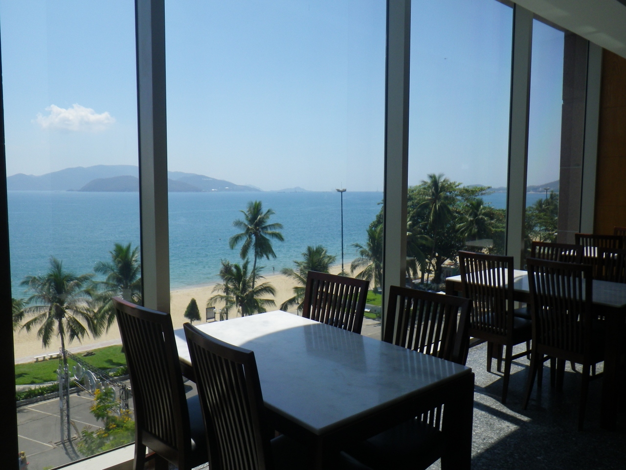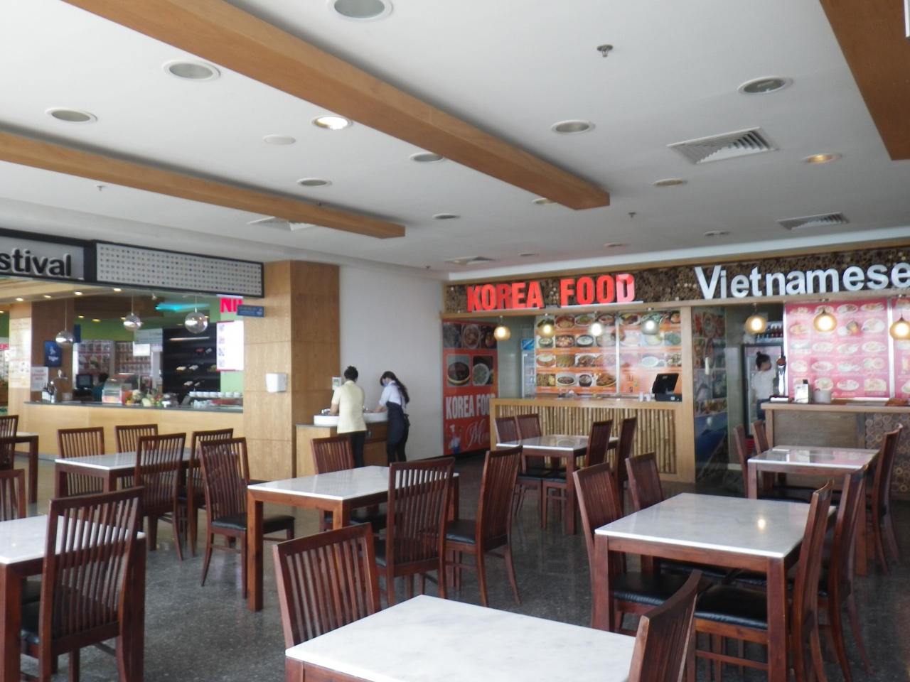 買い物後、更に上の階のフードコートへ行ってチェックしました。各国の料理もあって、カードにお金をチャージして利用する方法のようです。テーブル席にはガラス張りで写真のような景色が望めます。